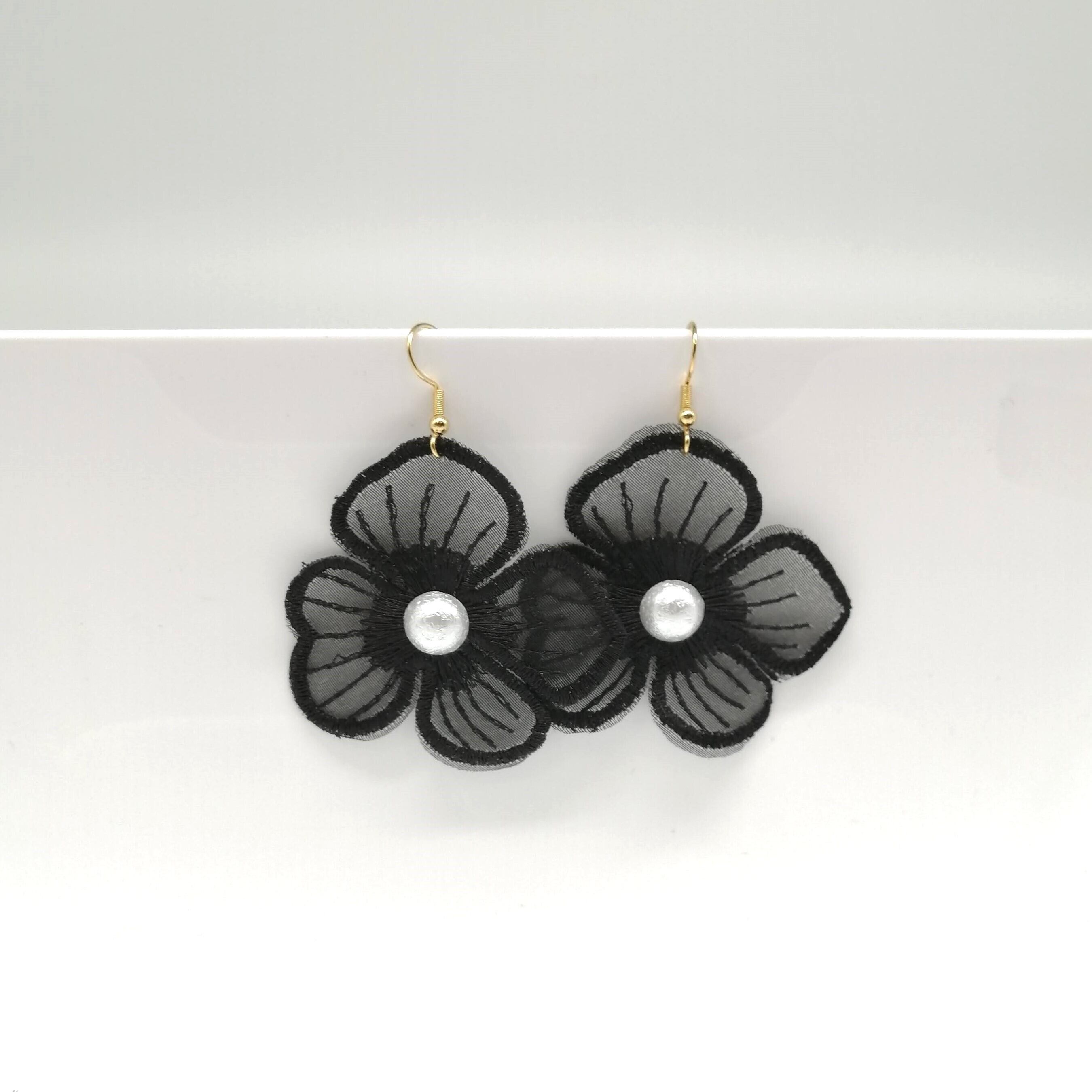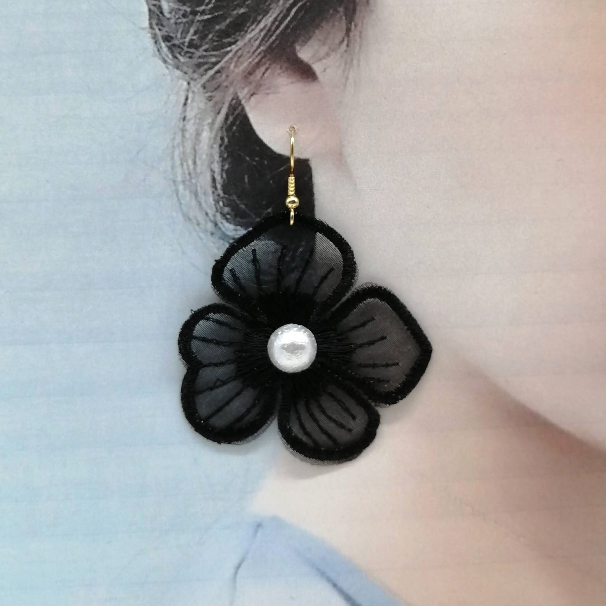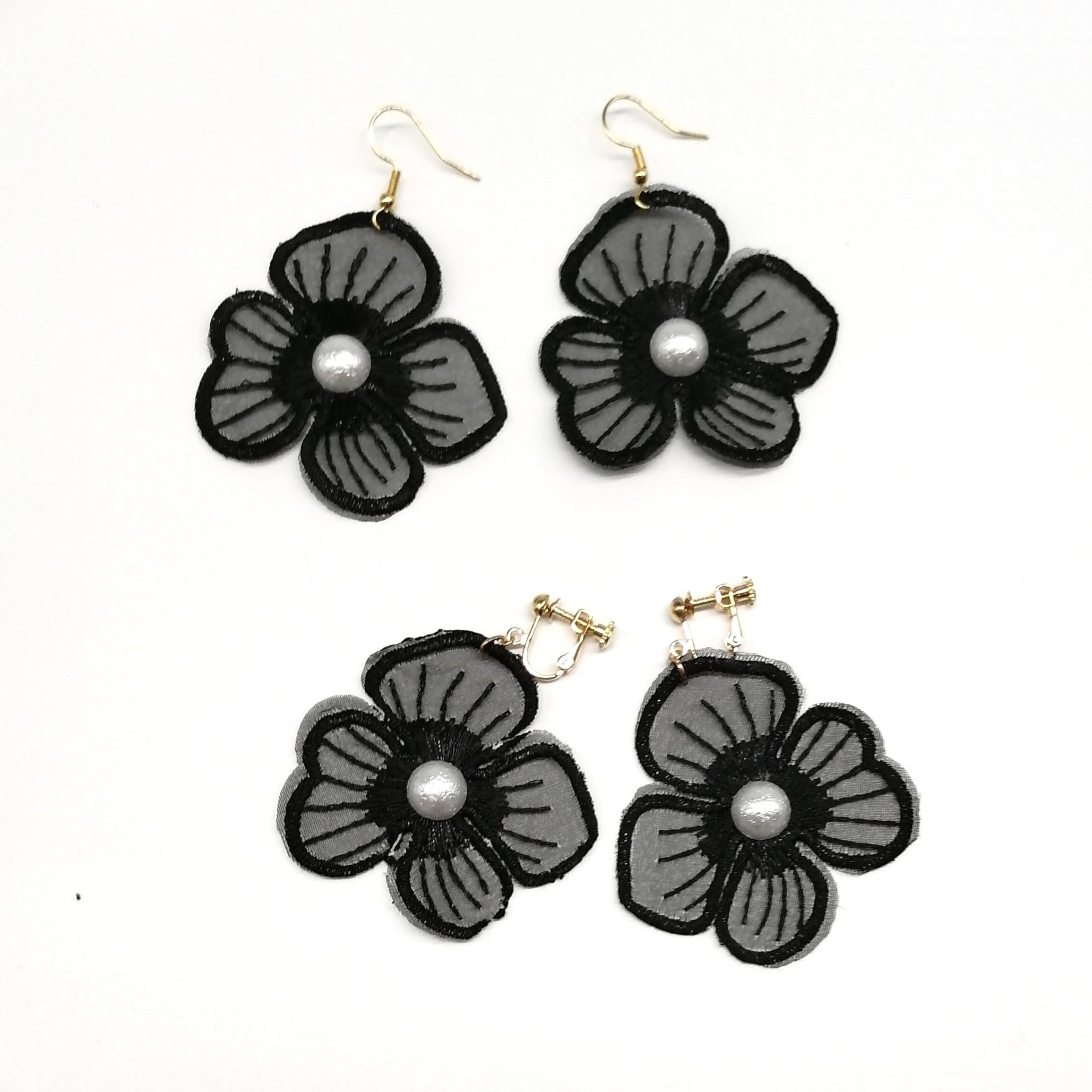 コットンパールとブラック花びらを合わせてモダンなピアスに仕上がりました。