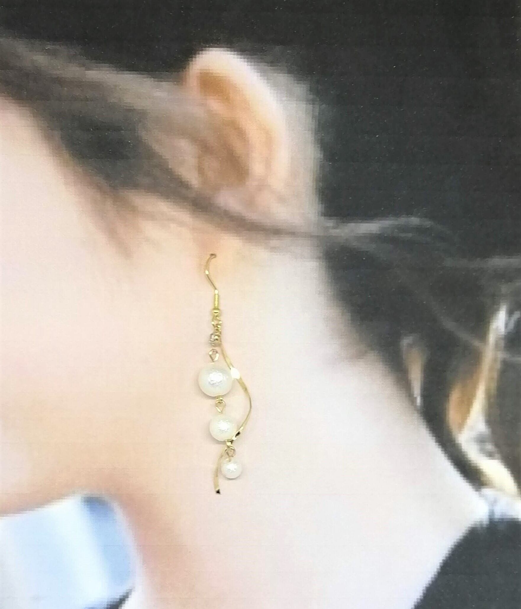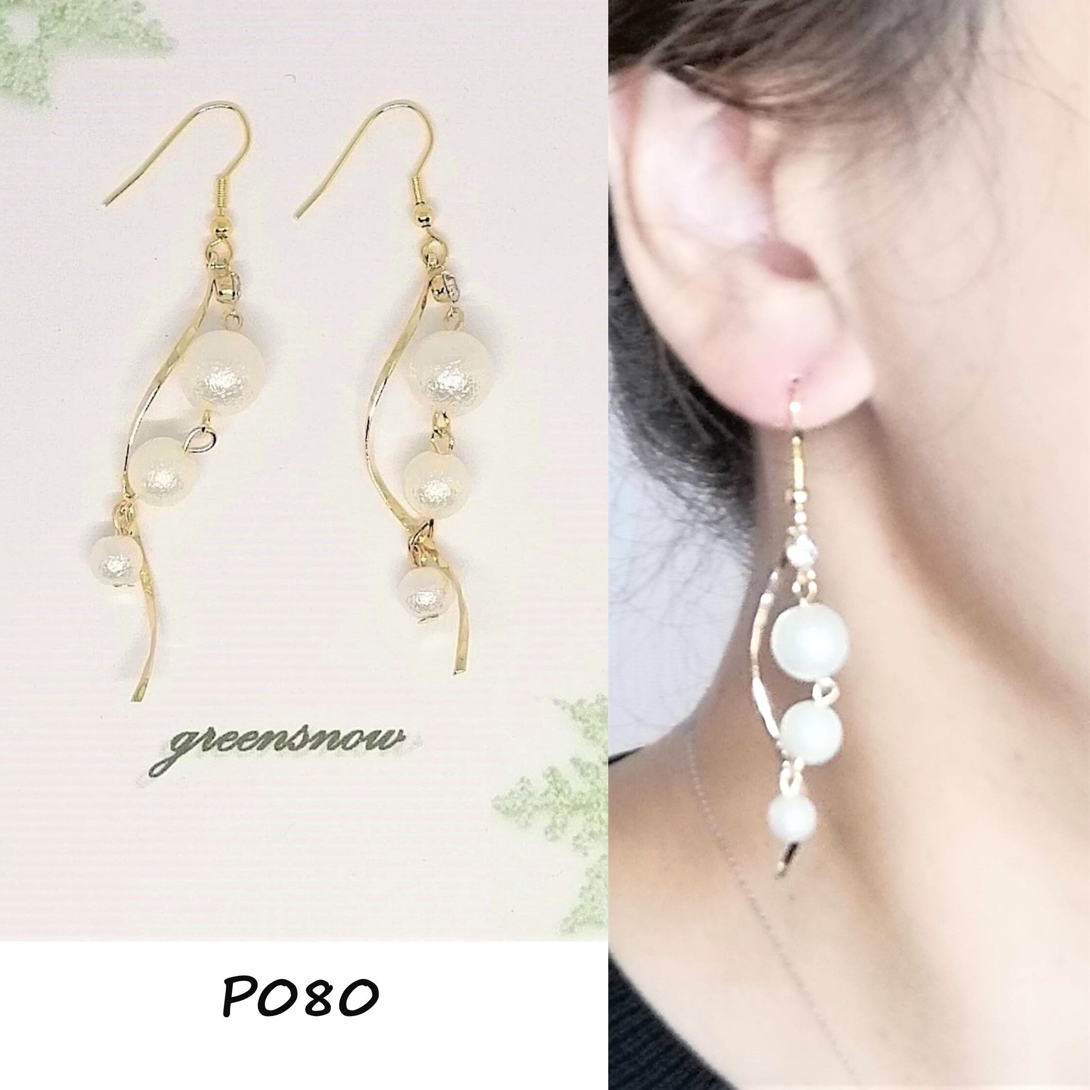 3個のコットンパールとウェーブスティックが上品でフェミニンなピアスに仕上げました。