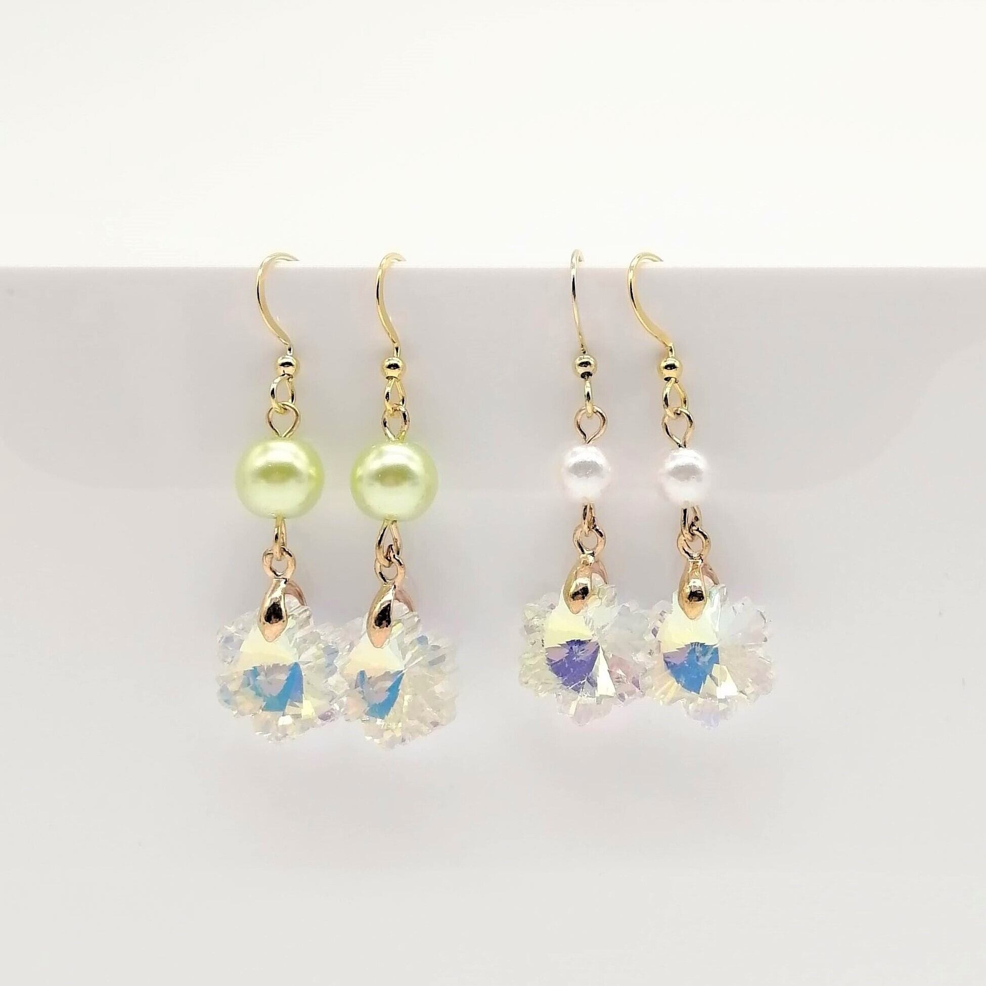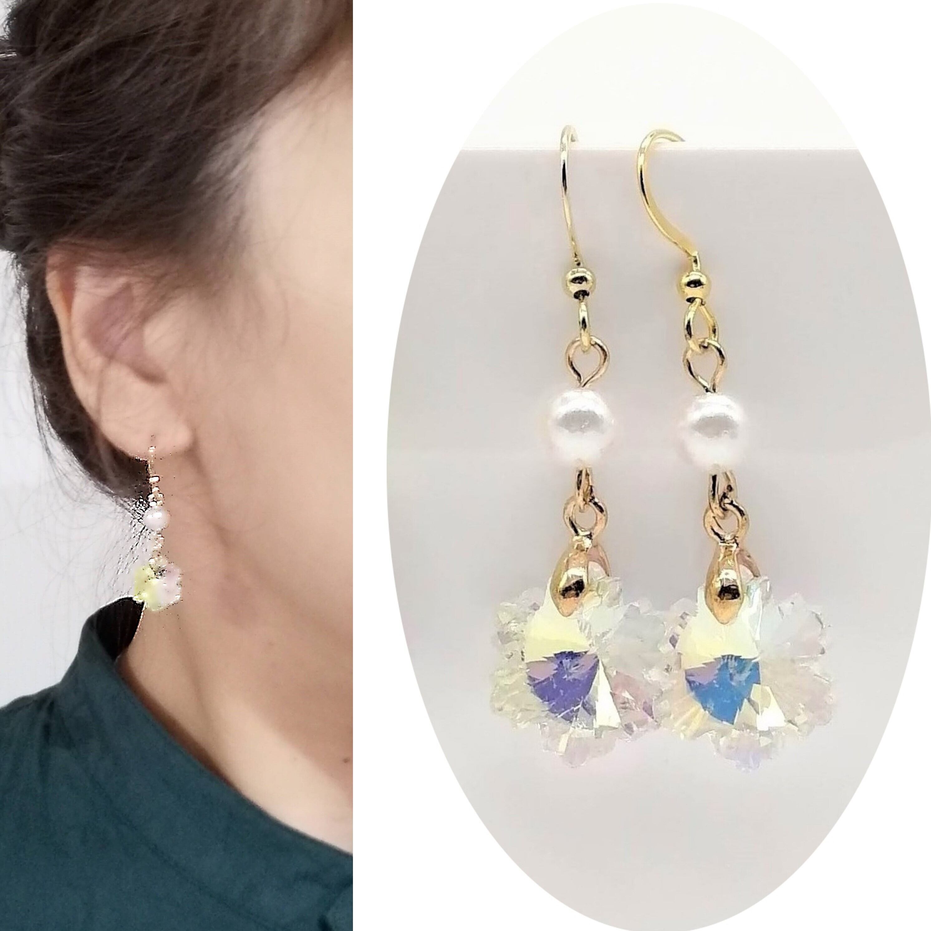 オローラ色の雪の結晶×パールを合わせたスタイリッシュなピアス。