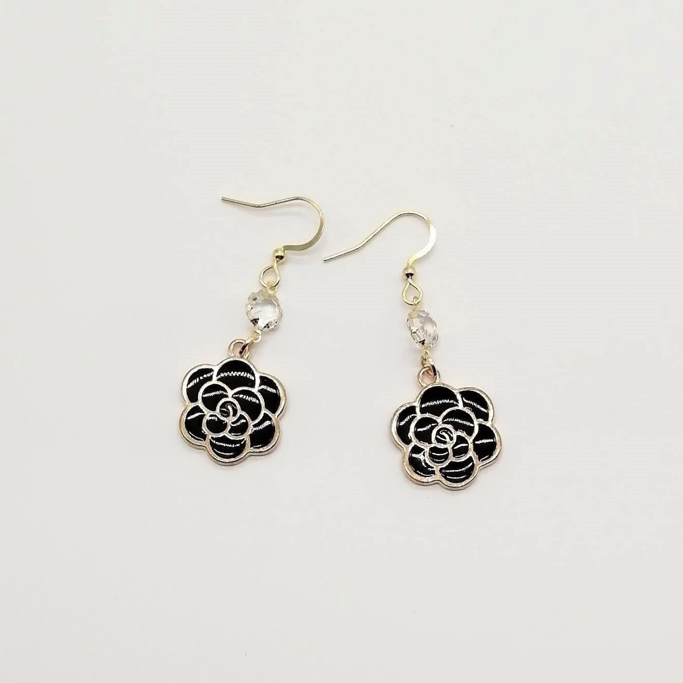 クリアカット面ガラス ×黒ローズチャームを組み合わせたピアスです。