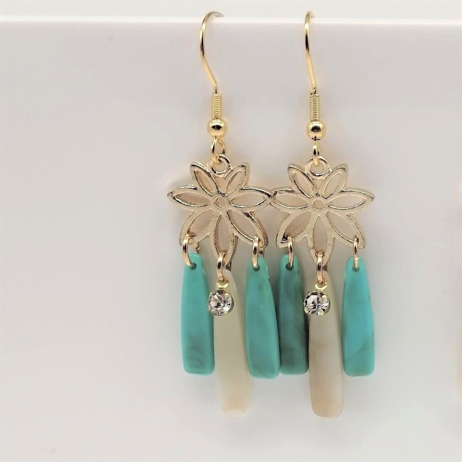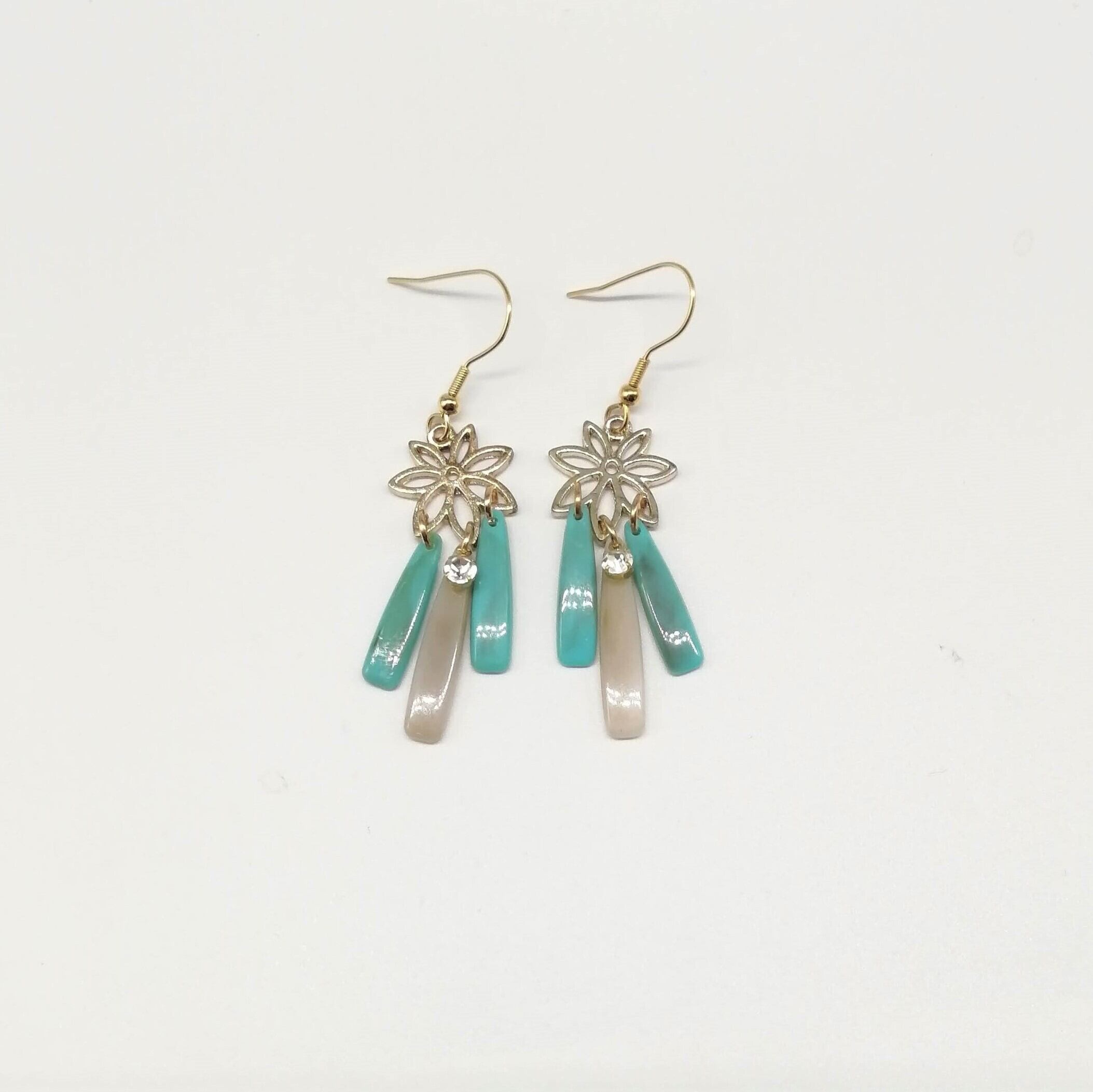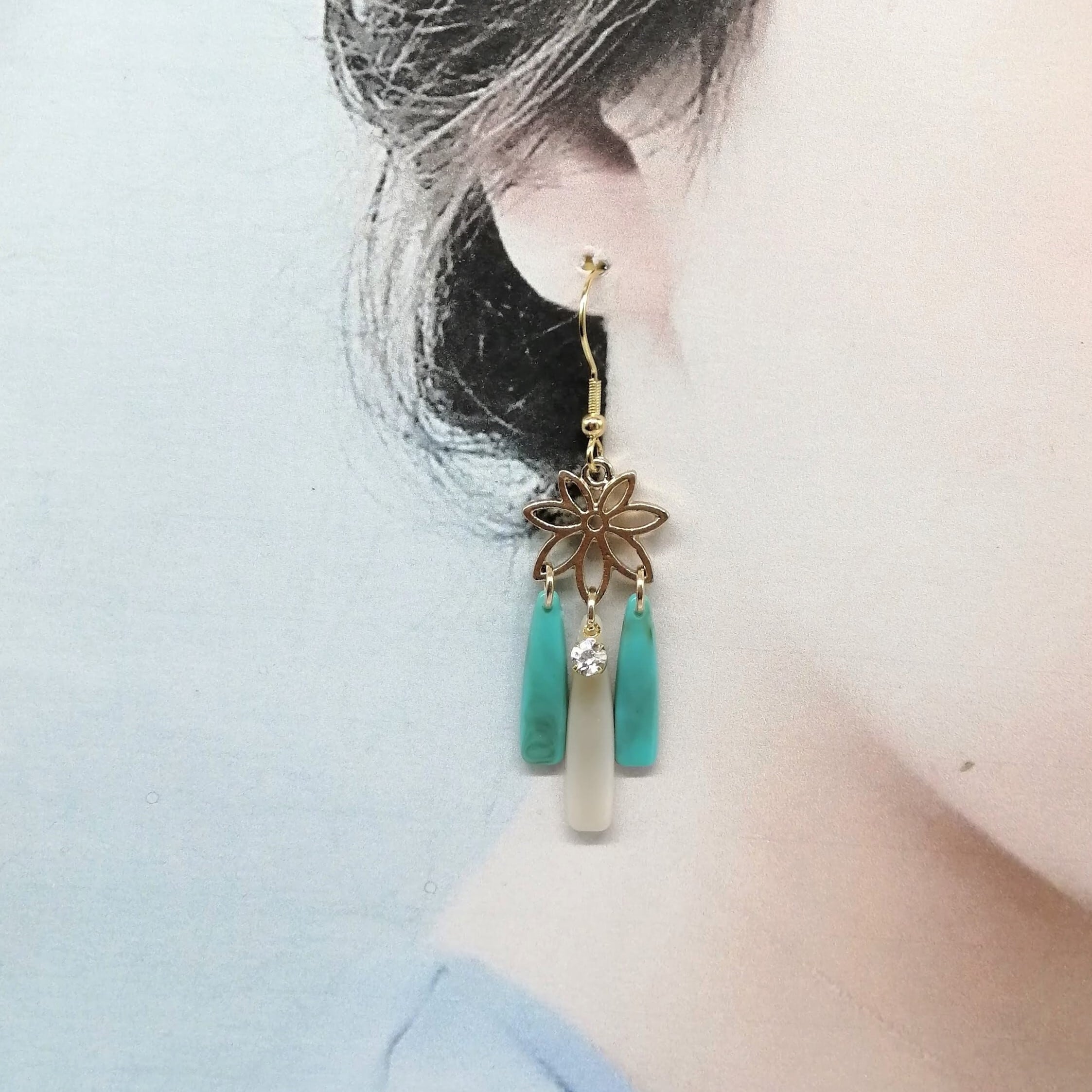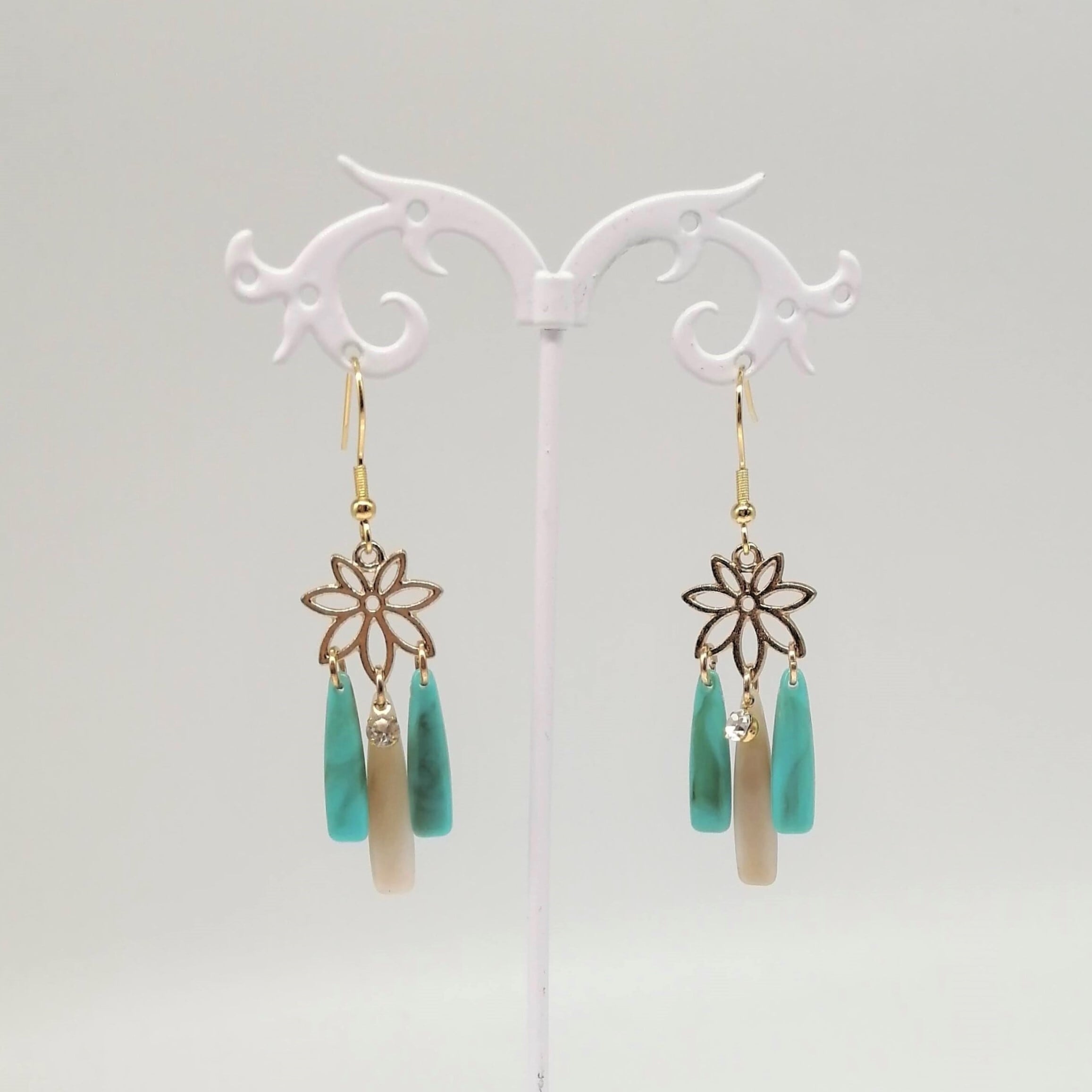 葉にベージュ・ターコイズ色のしずく×ストーンを組み合わせた個性のあるピアスです。