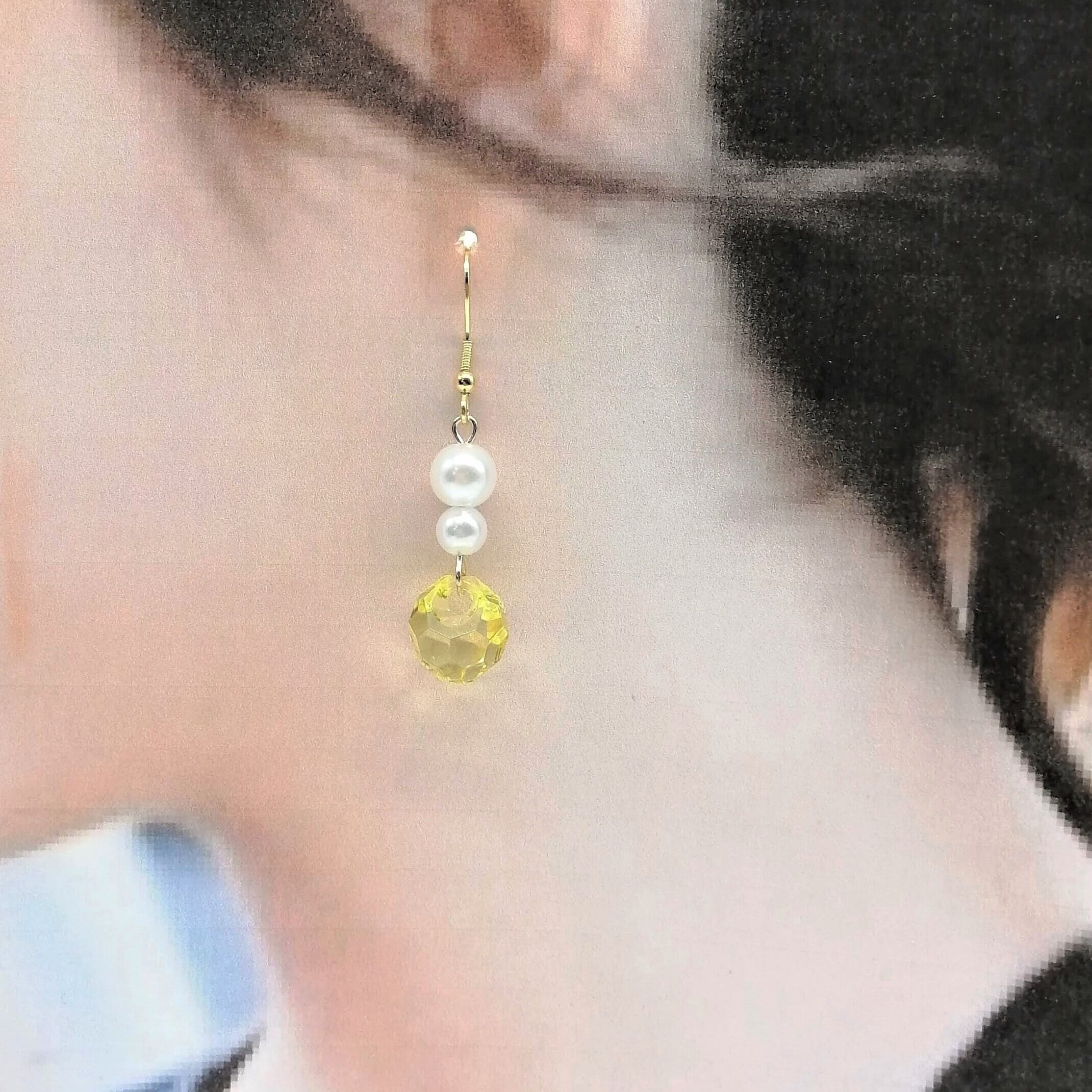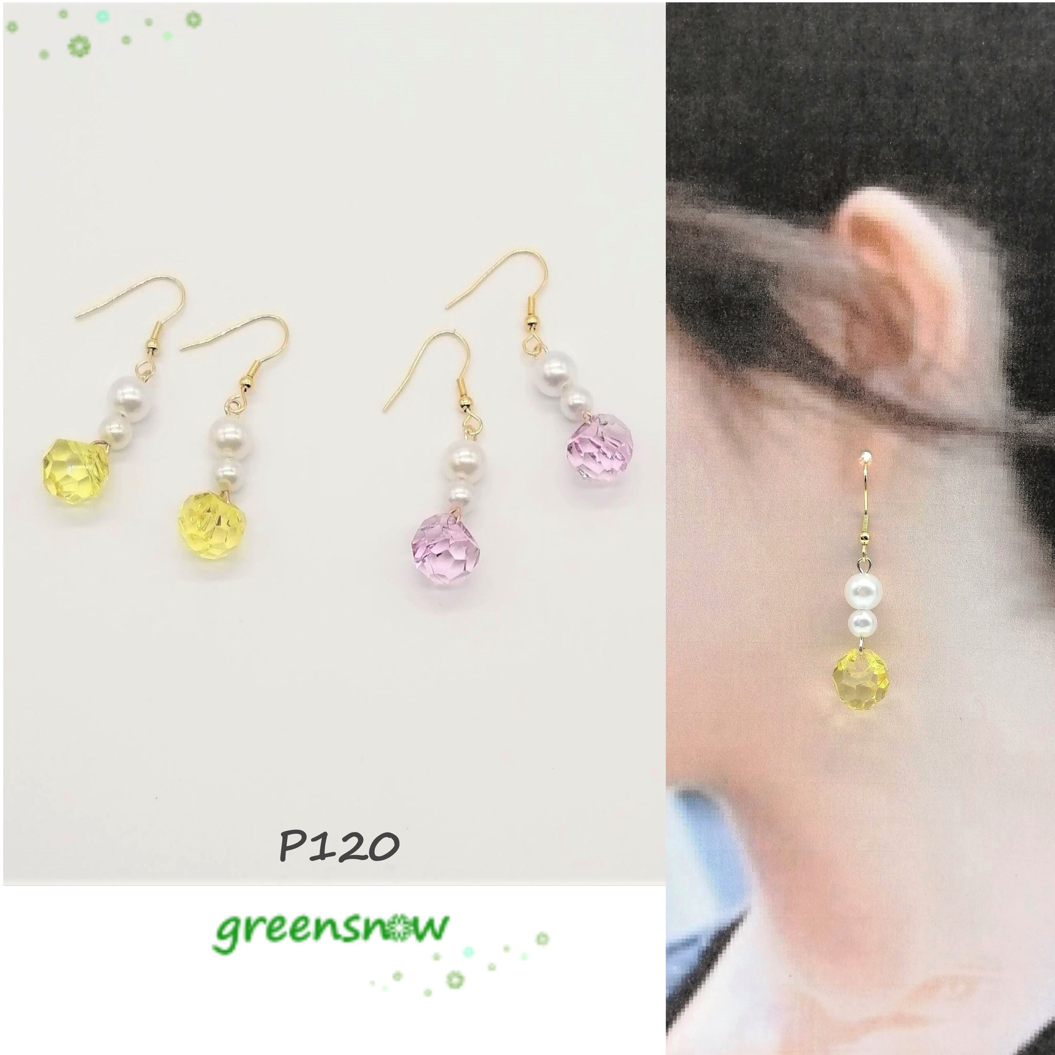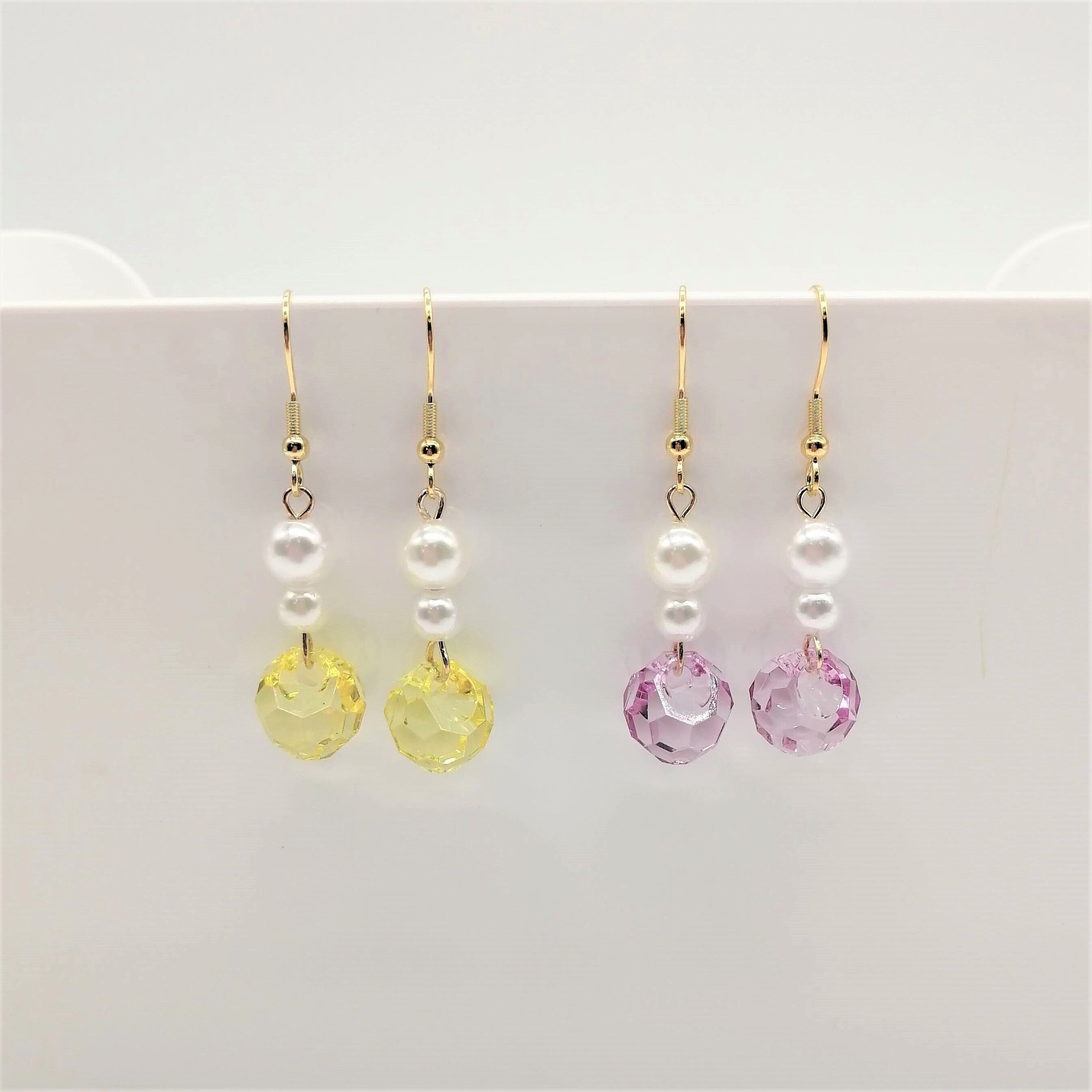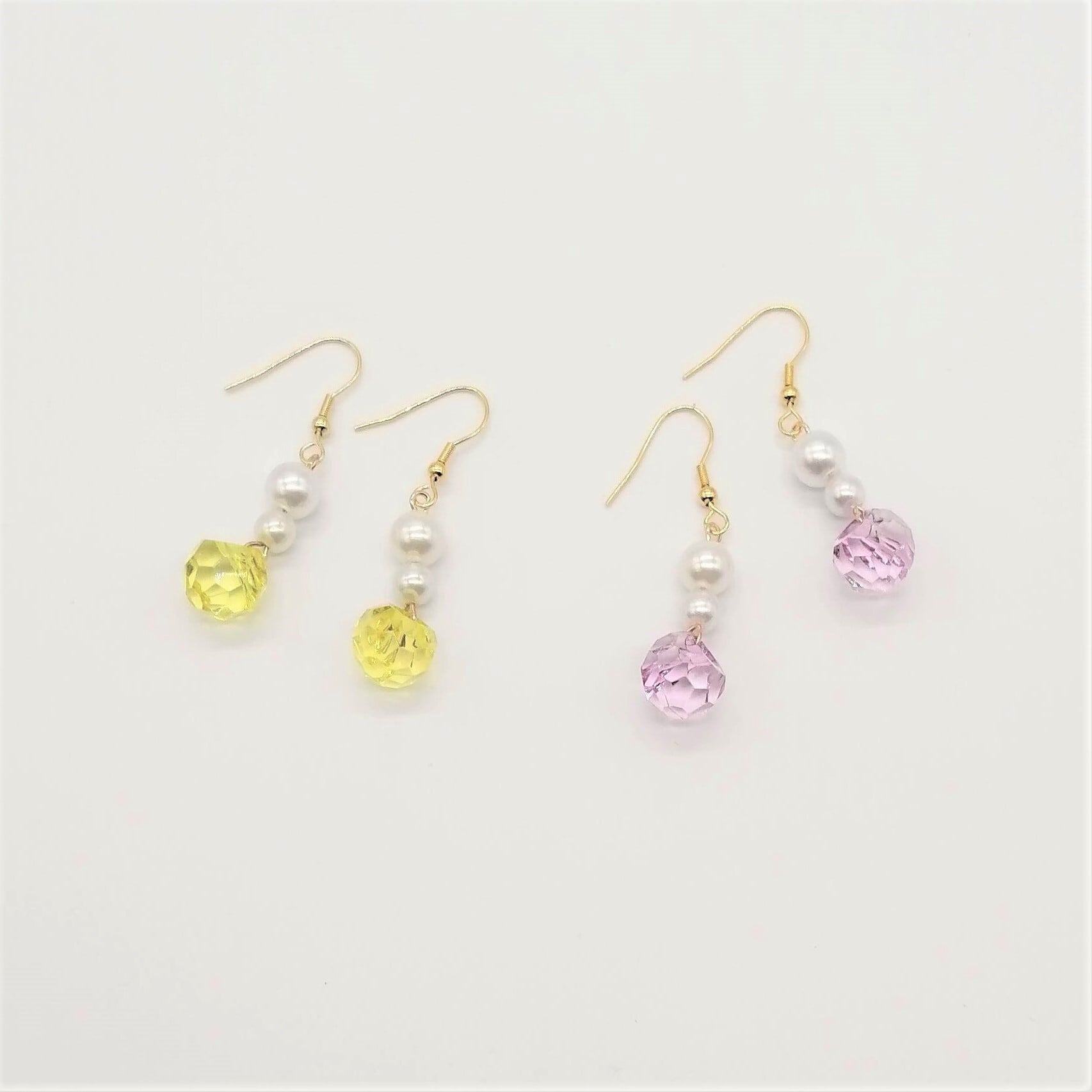 パール×イエロー、パープルのファンシービーズを合わせたピアスです。
