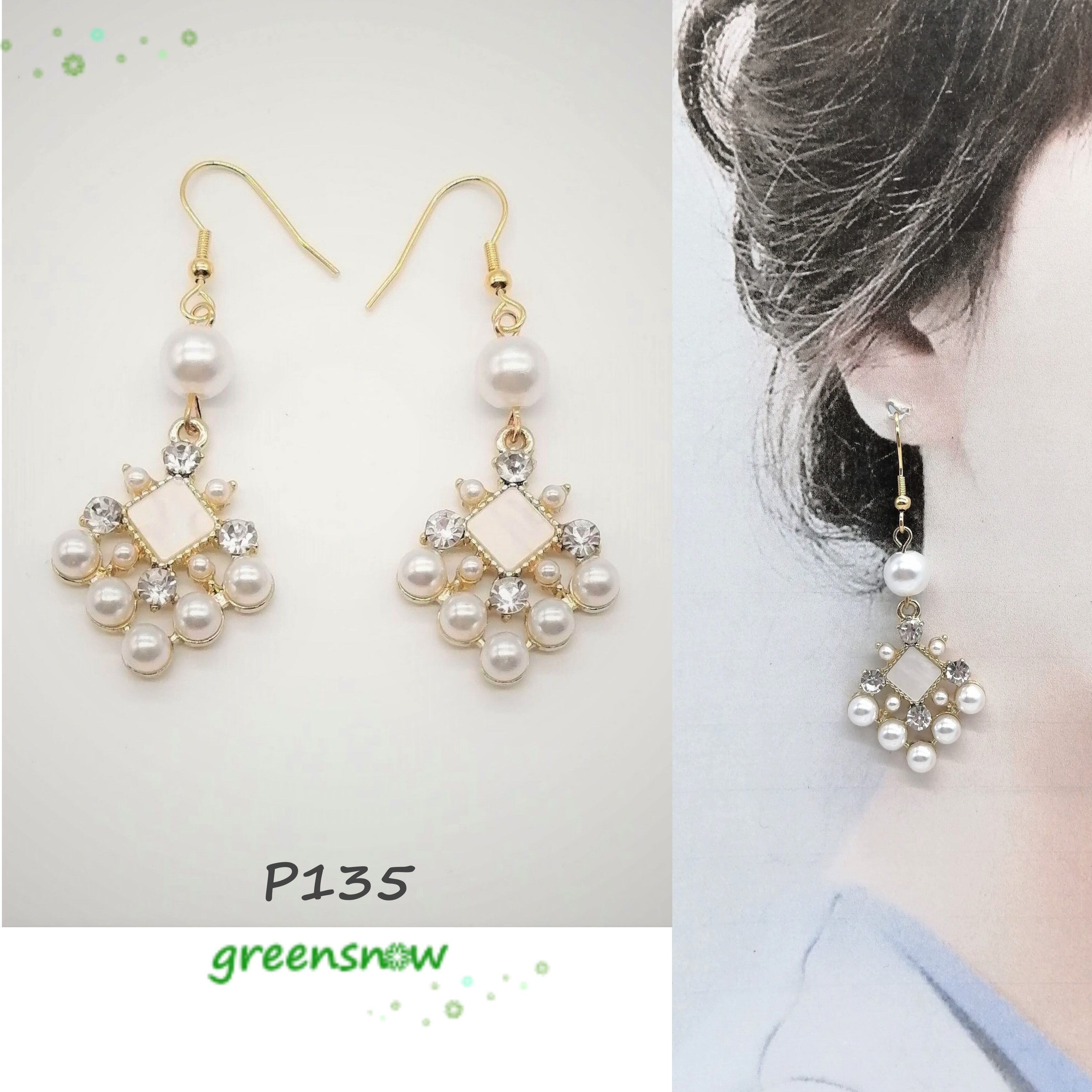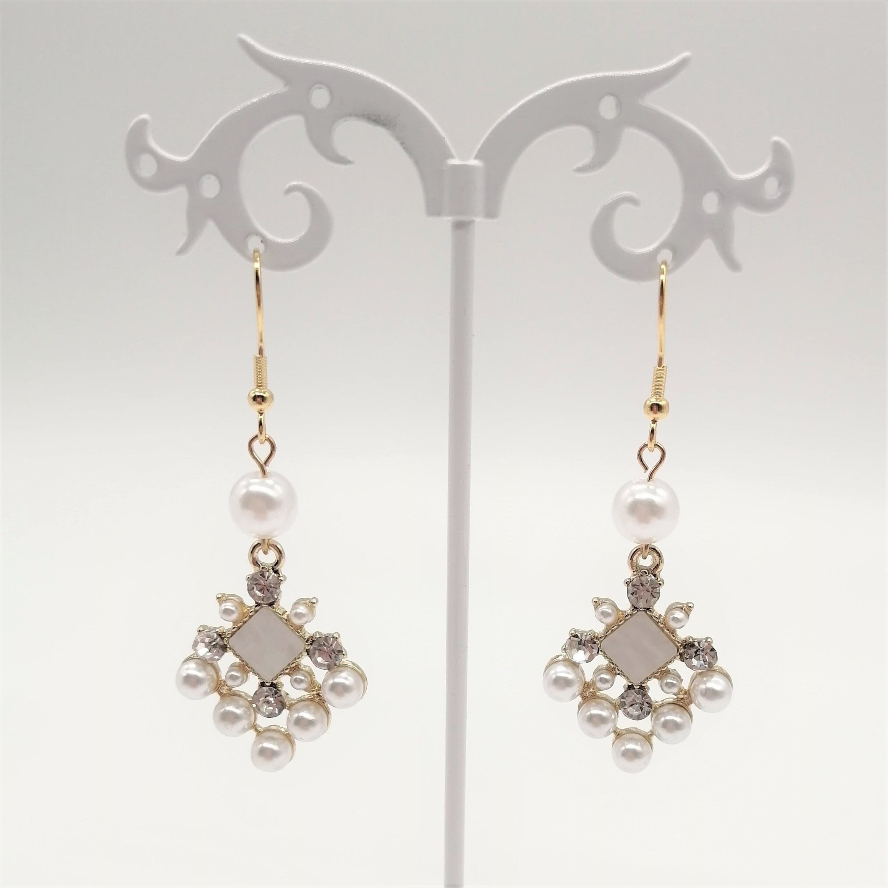 【サージカルステンレス ピアス】パール ラインストーン 菱形 ひし形 イアリング変更可