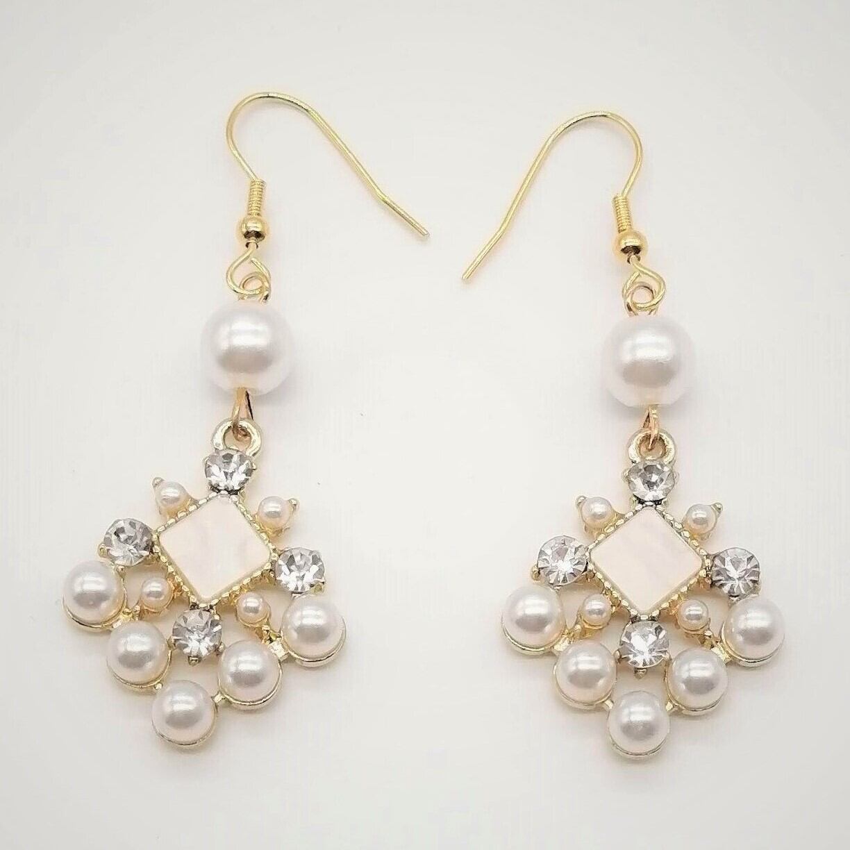 ホワイト色のパール×ひし形のラインストーンを合わせたピアスです。