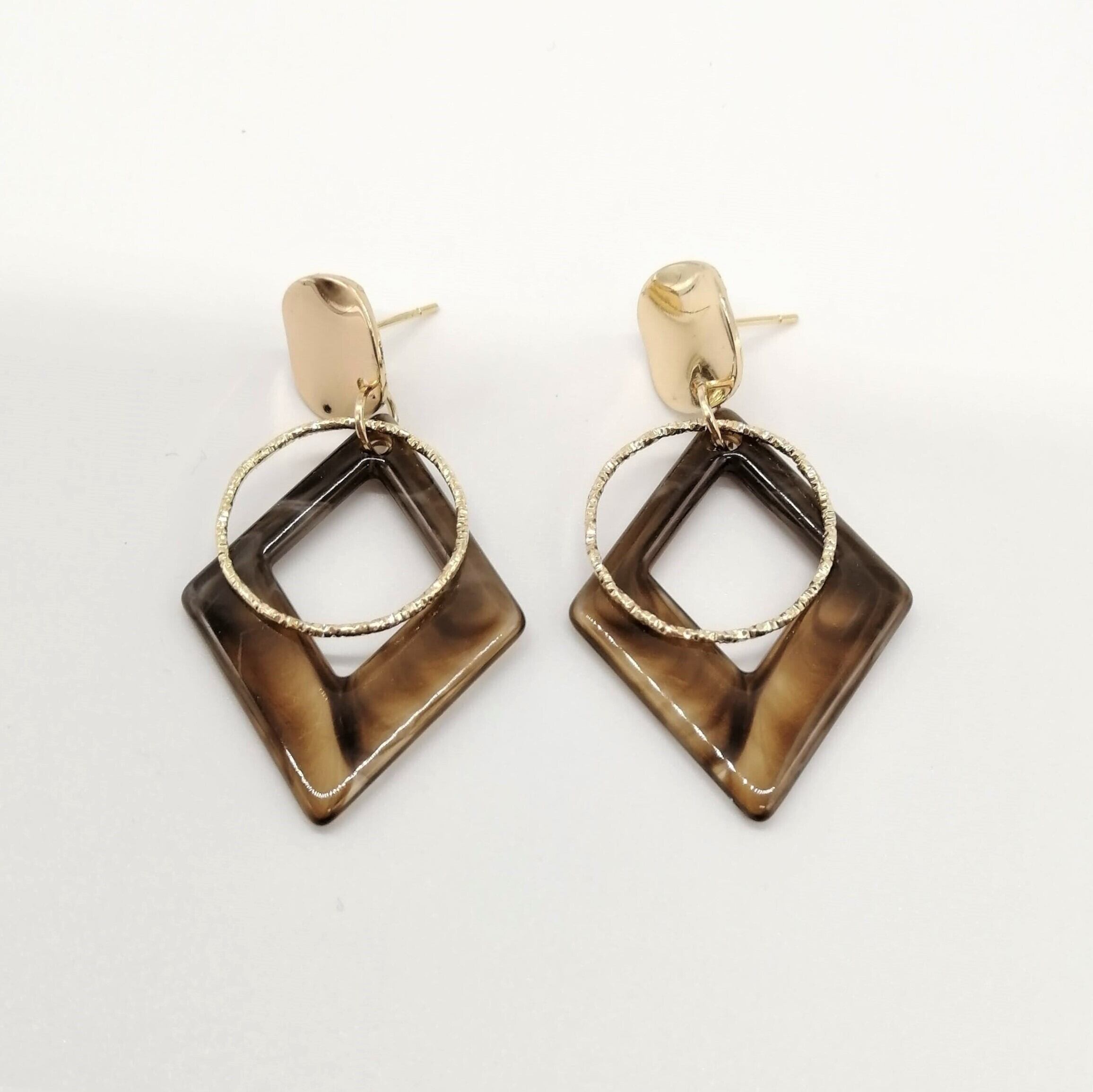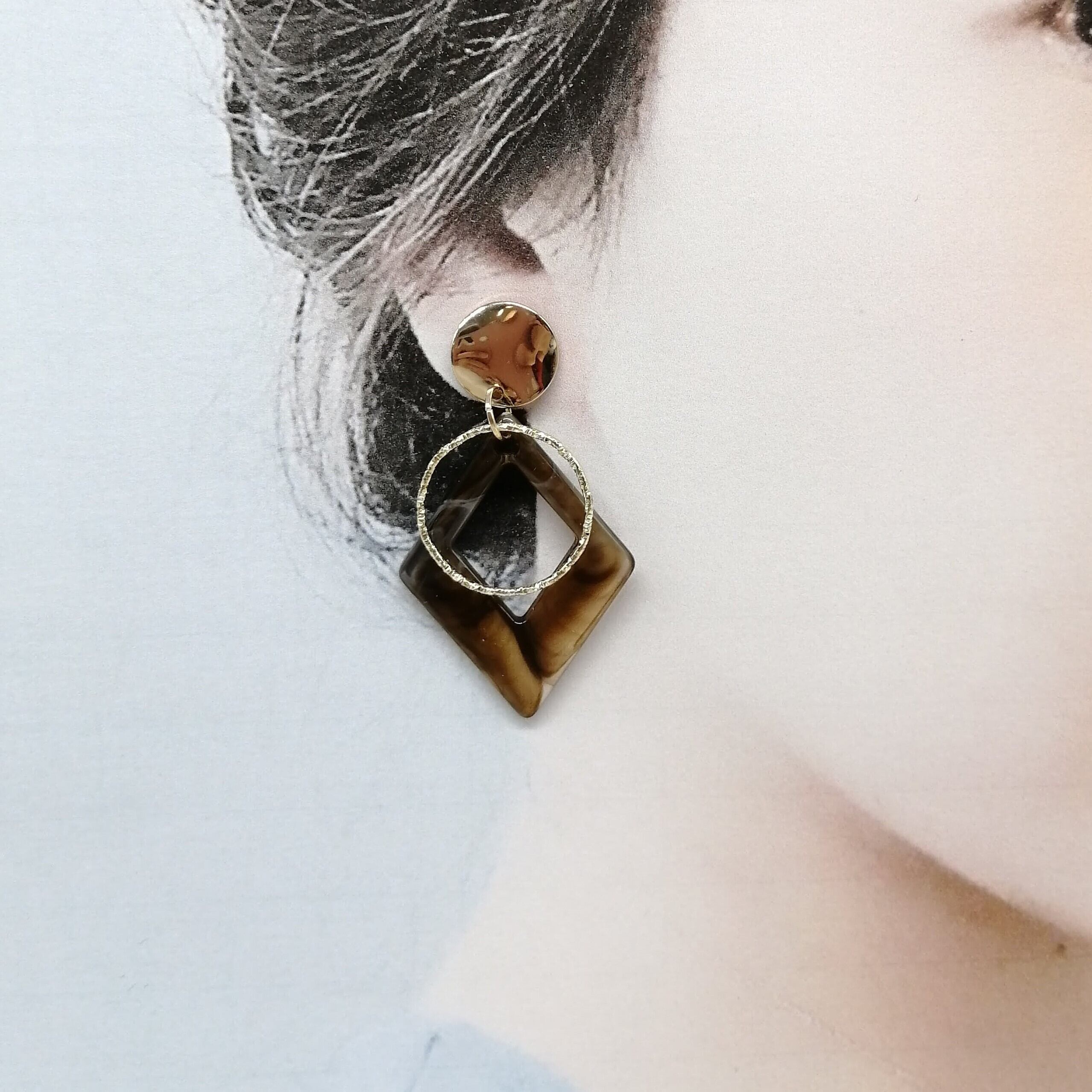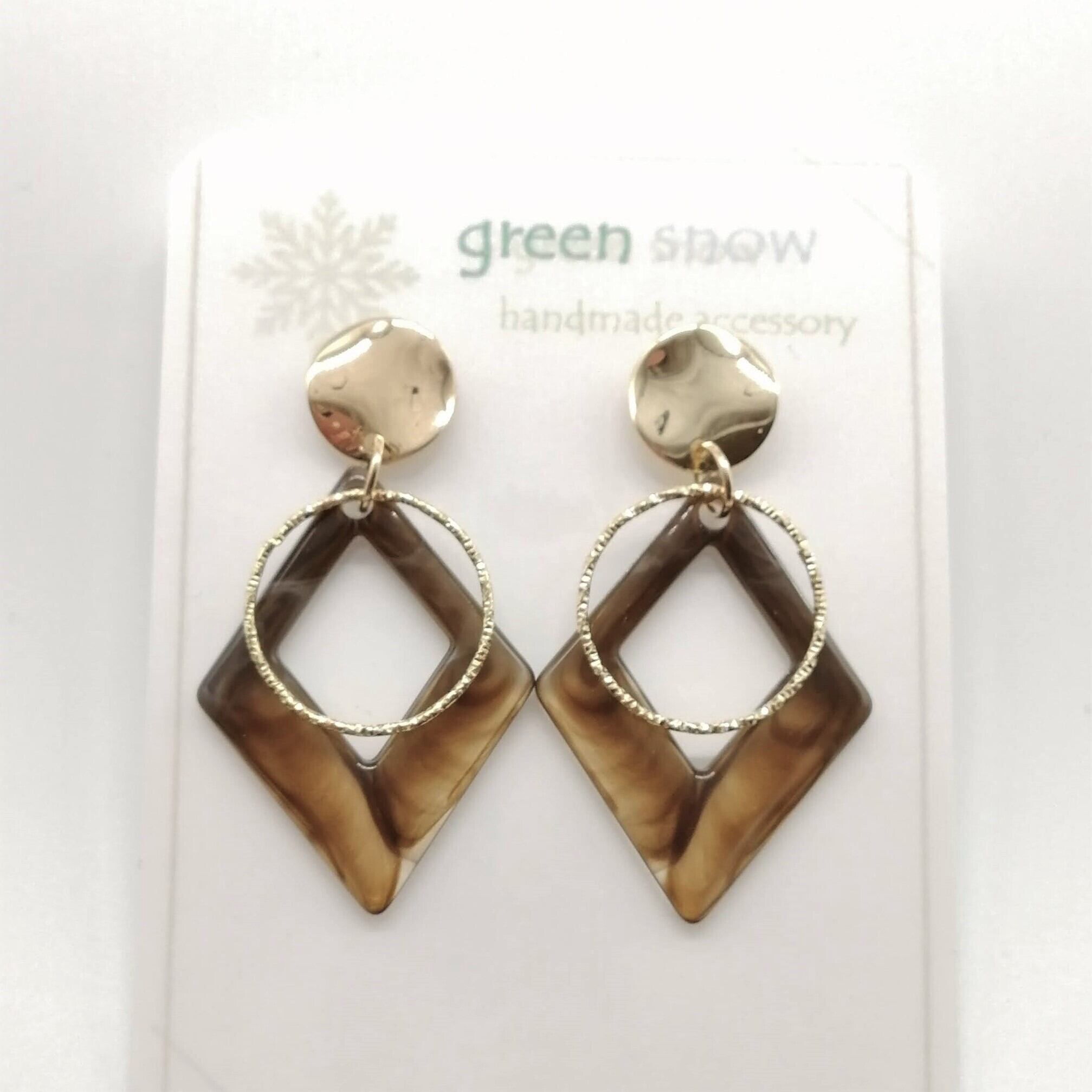 変形ゴールドラウンド×ブラウン色のひし形マーブル×ツイストラウンドを合わせたピアスです。