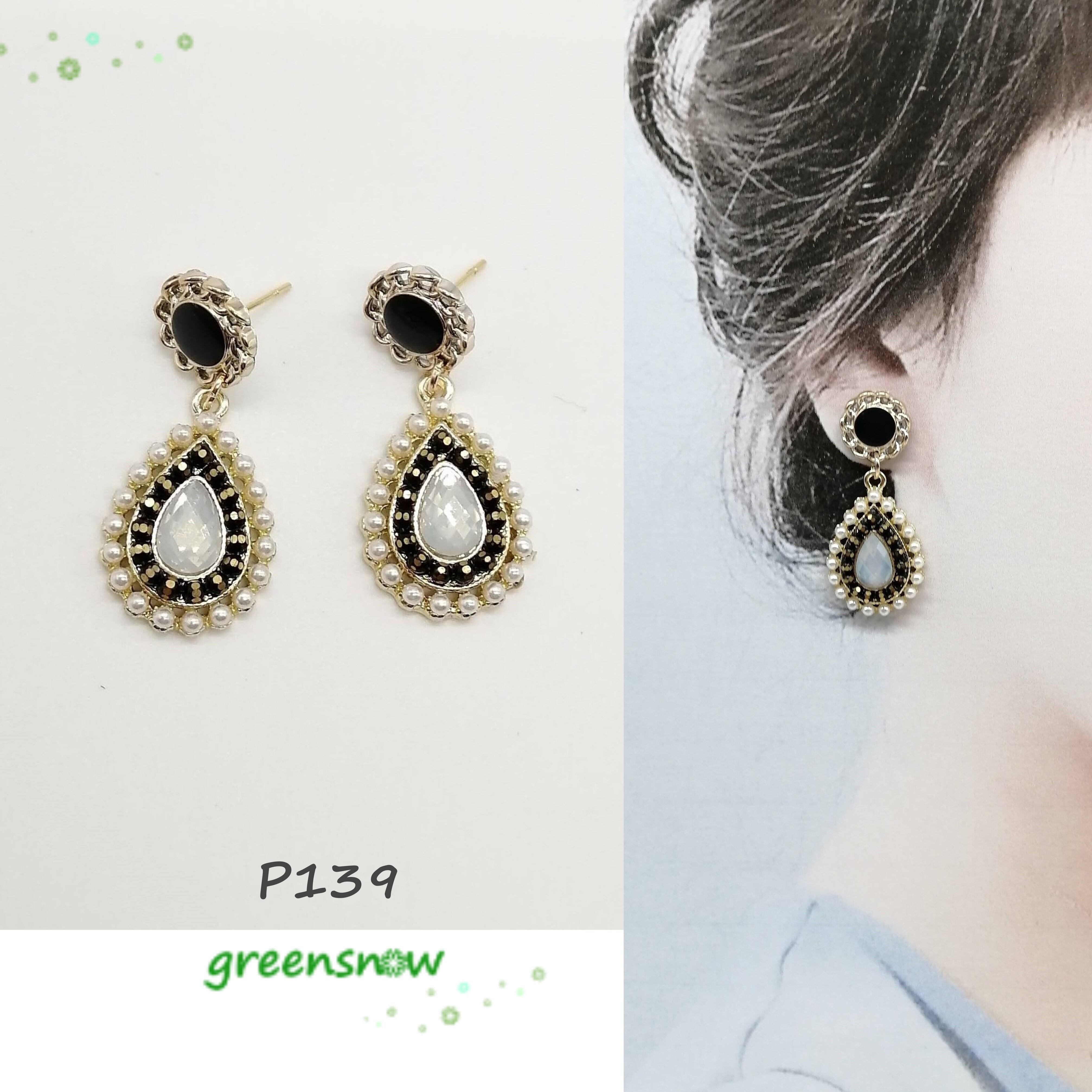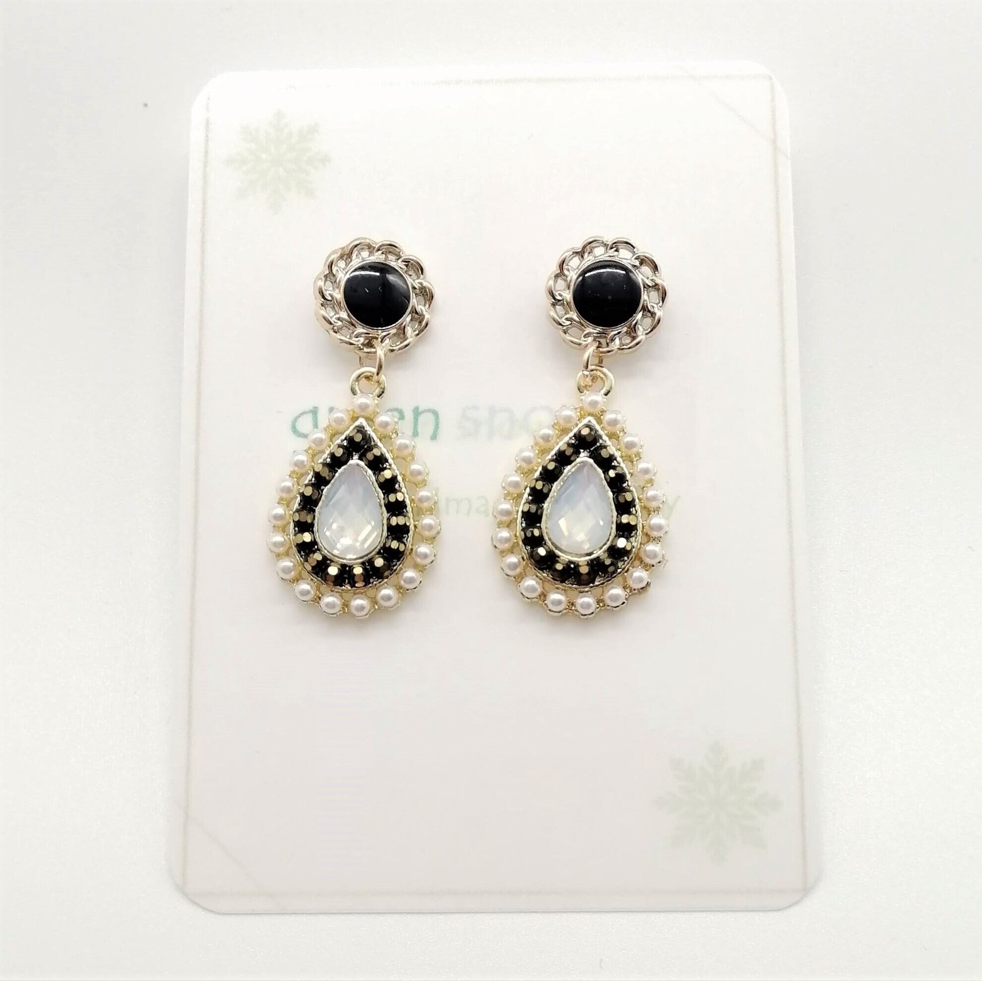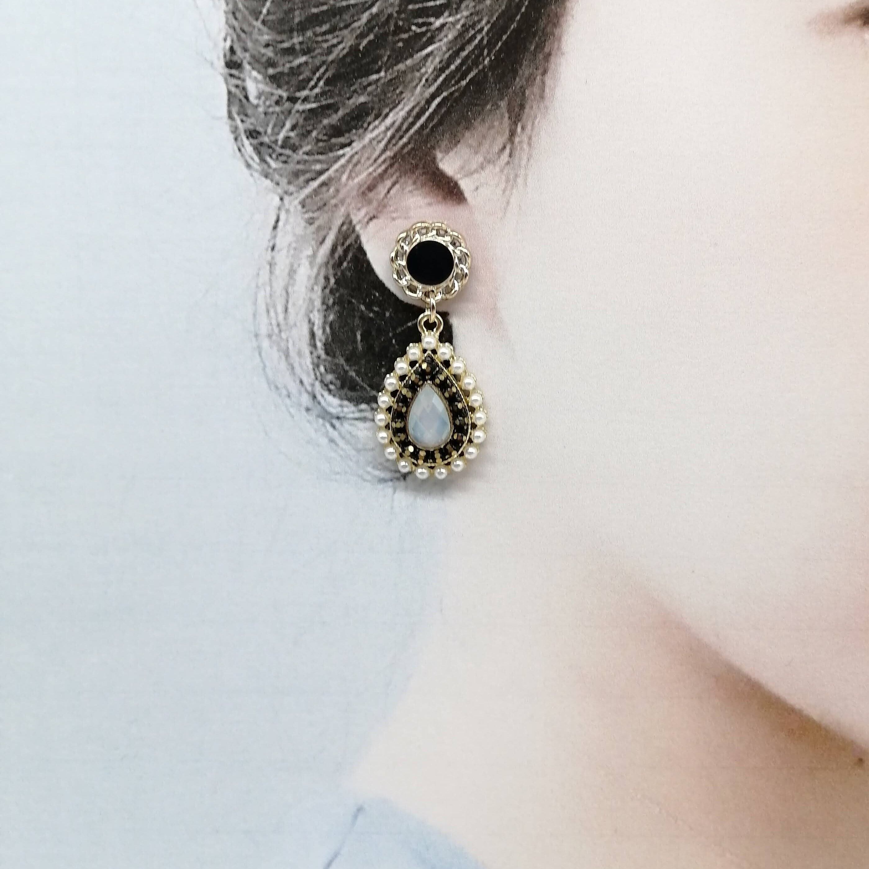 ブラック色のボタン×パール&ストーンの雫を合わせたピアスです。