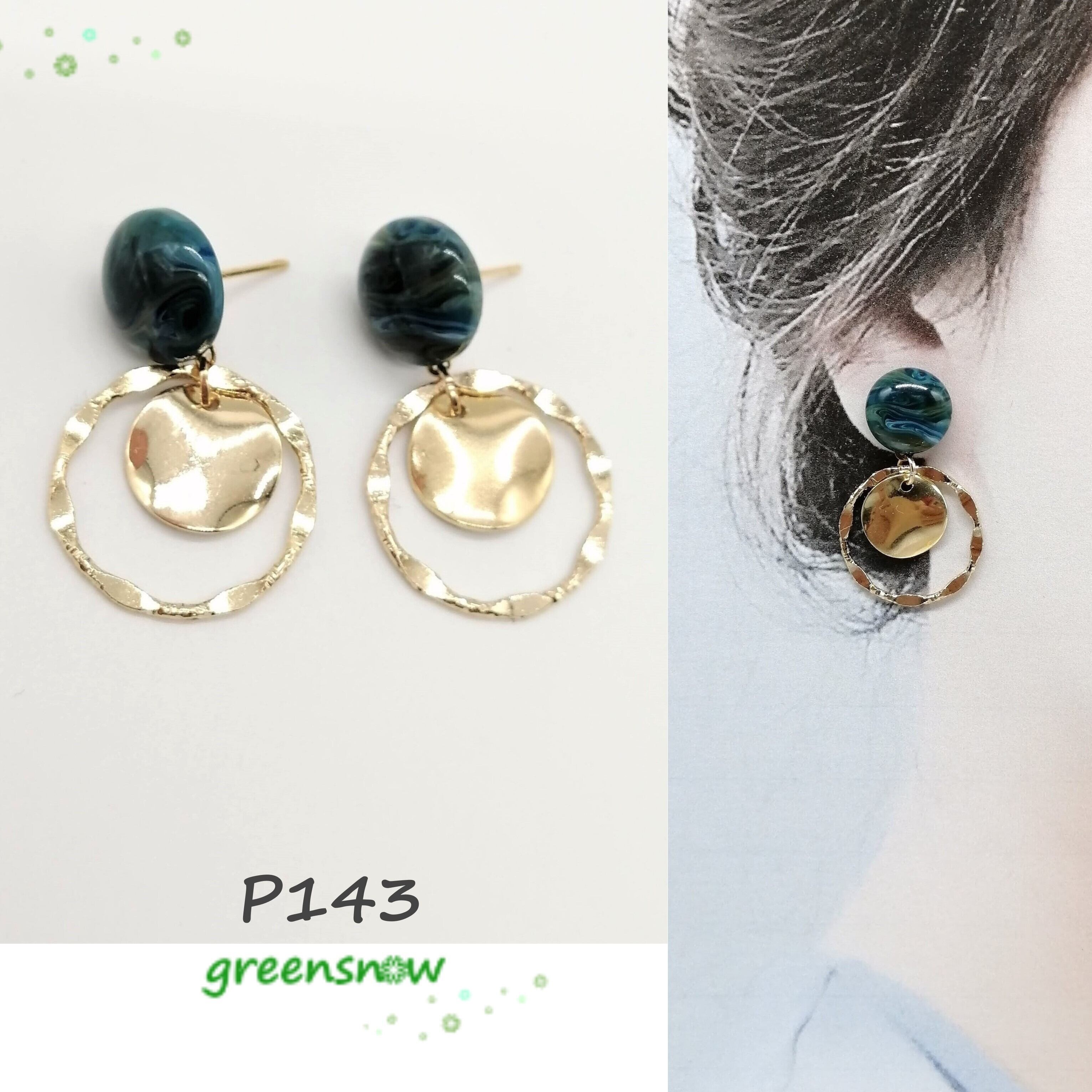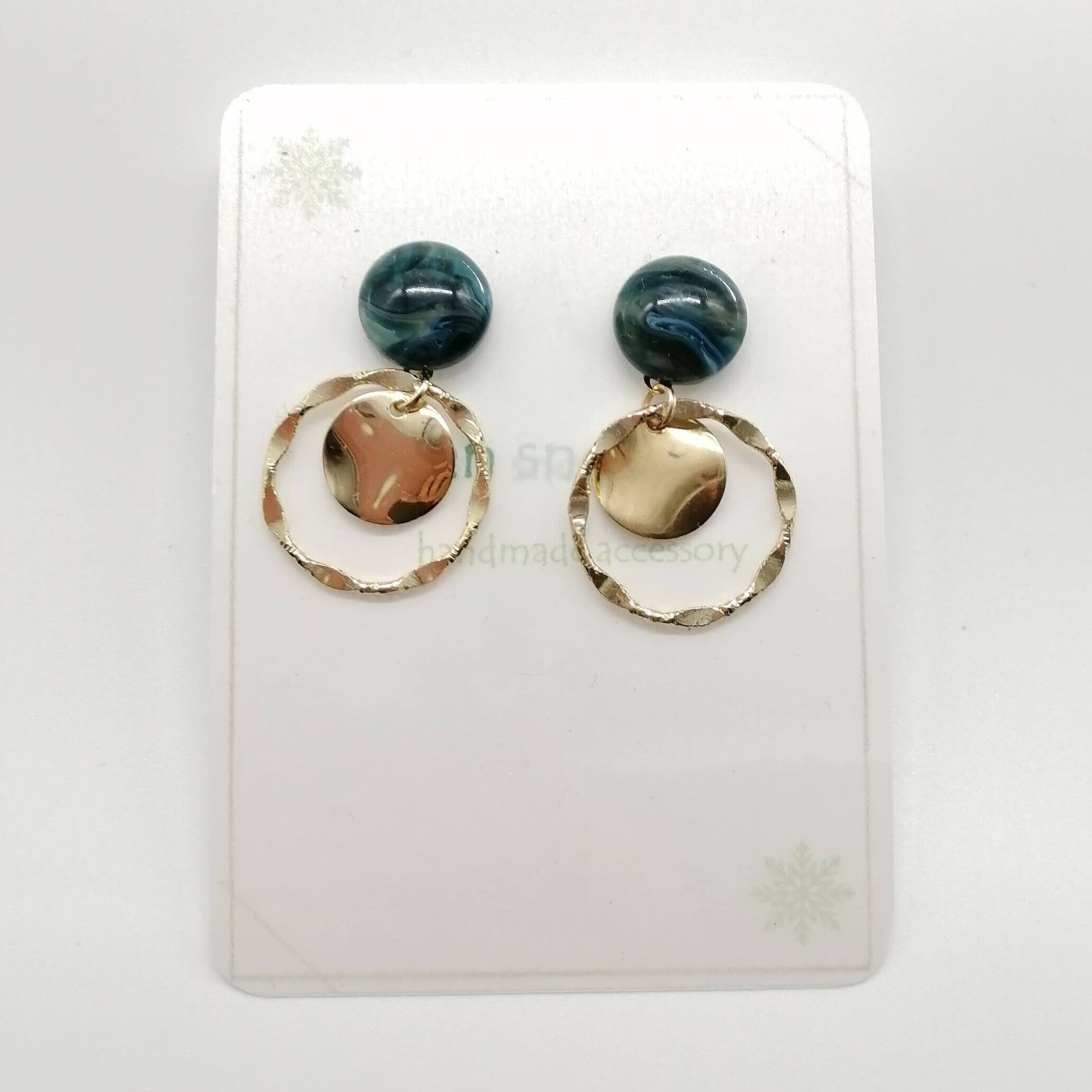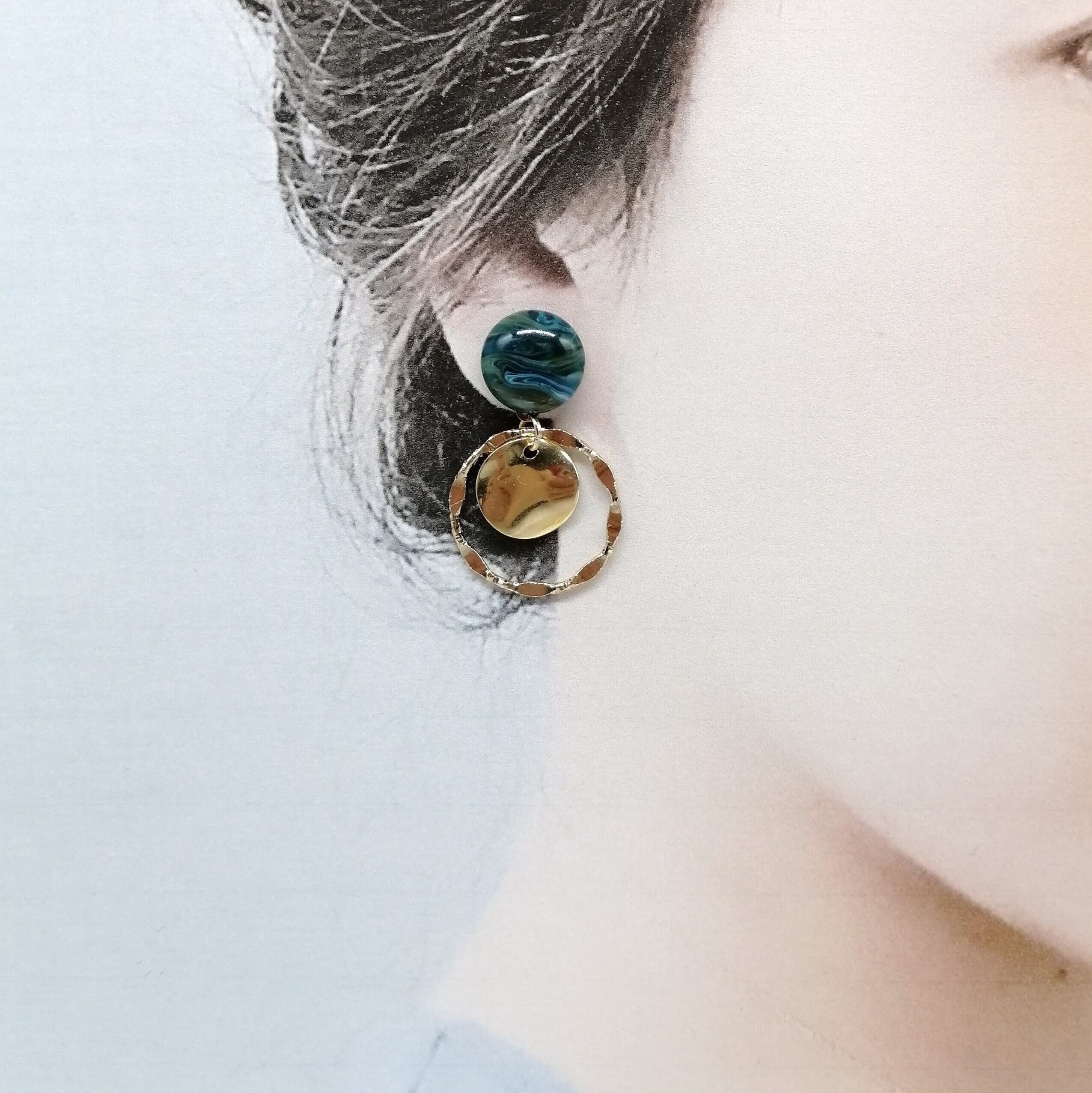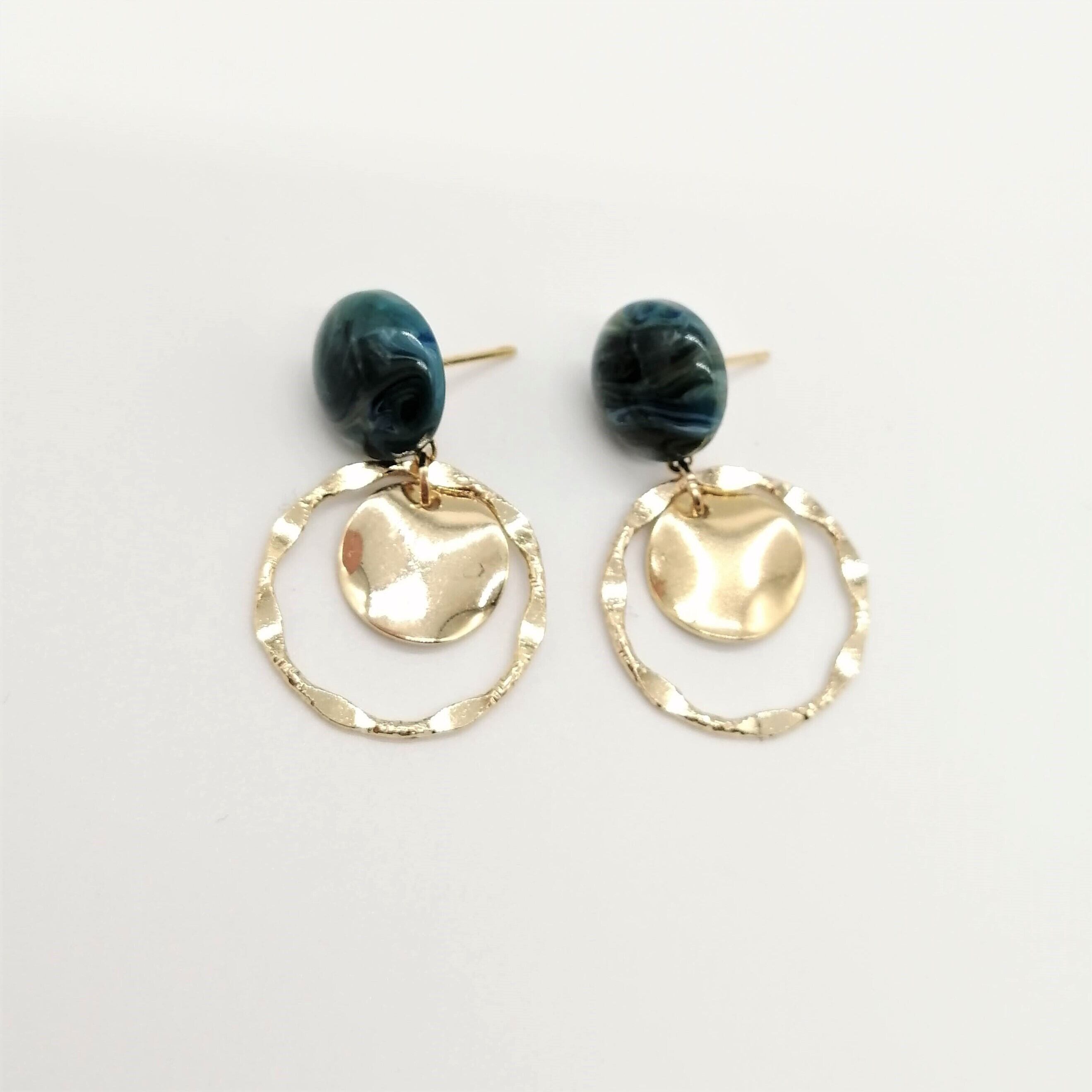 小さめのネイビー色マーブル×ツイストリング×ウェーブラウンドの組み合わせのピアスです。