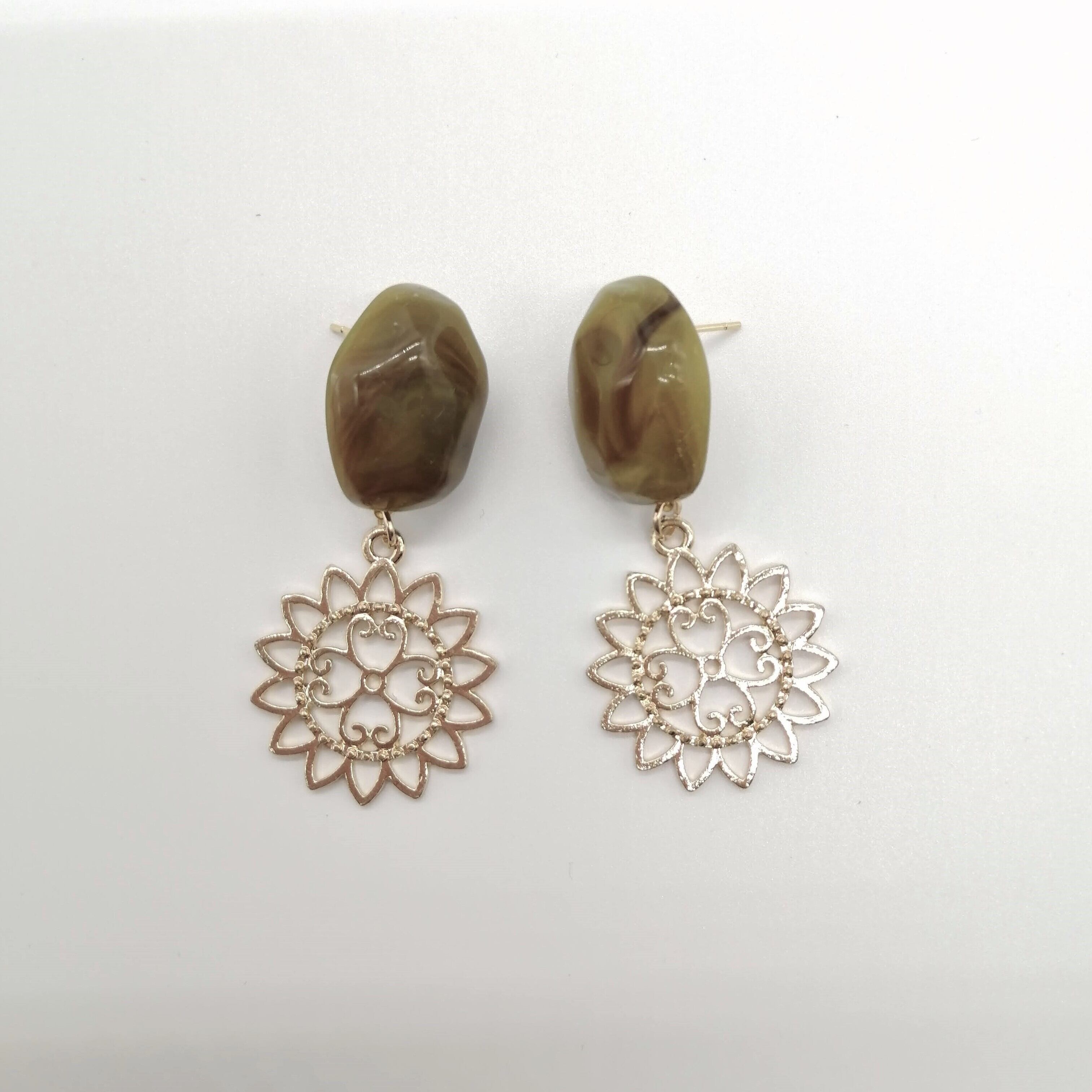 不規則カットのオーバル×フラワーチャームをあわせたピアスです。
