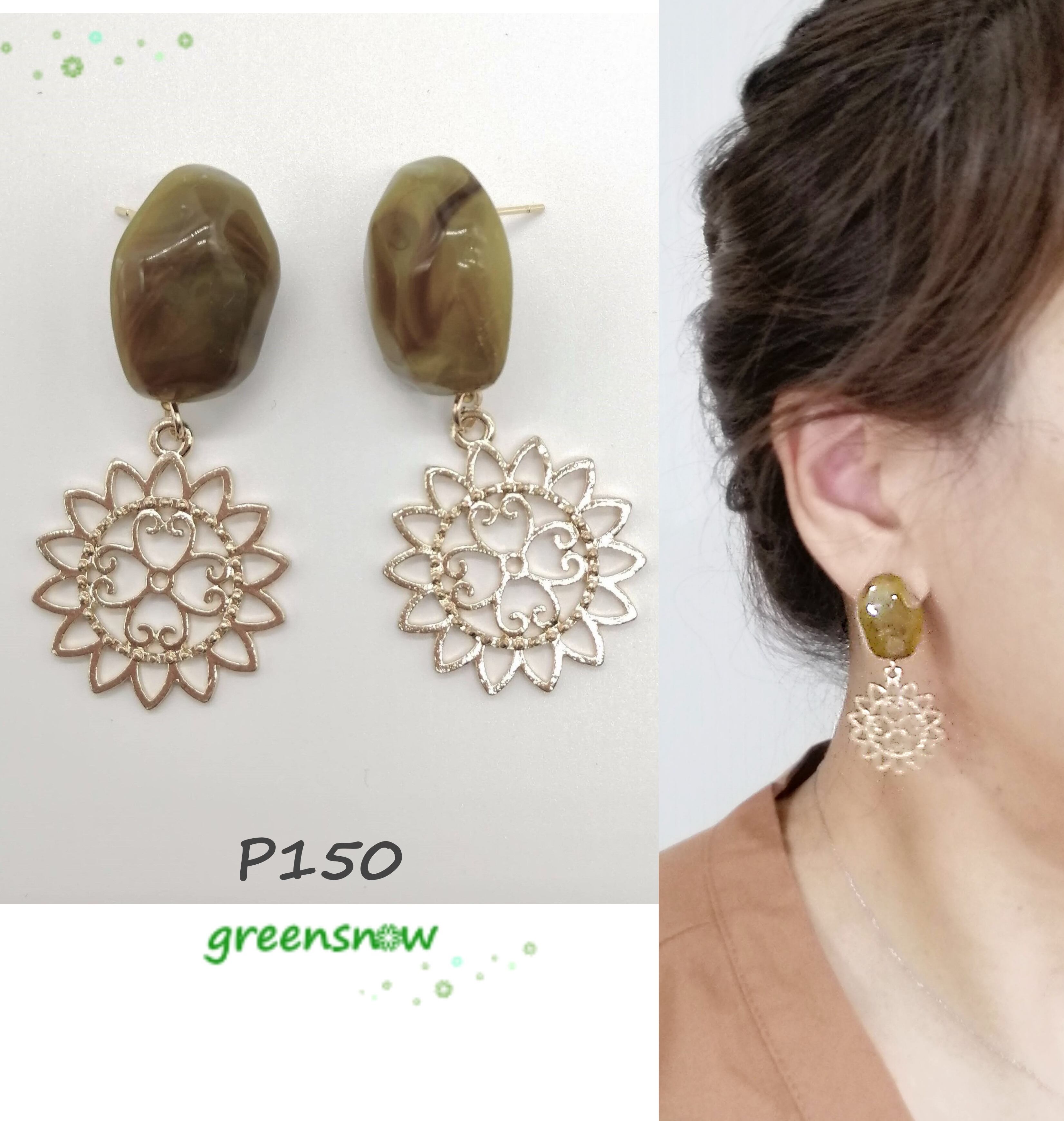 【サージカルステンレス ピアス】不規則カット オーバル グリーン フラワー イアリング変更可