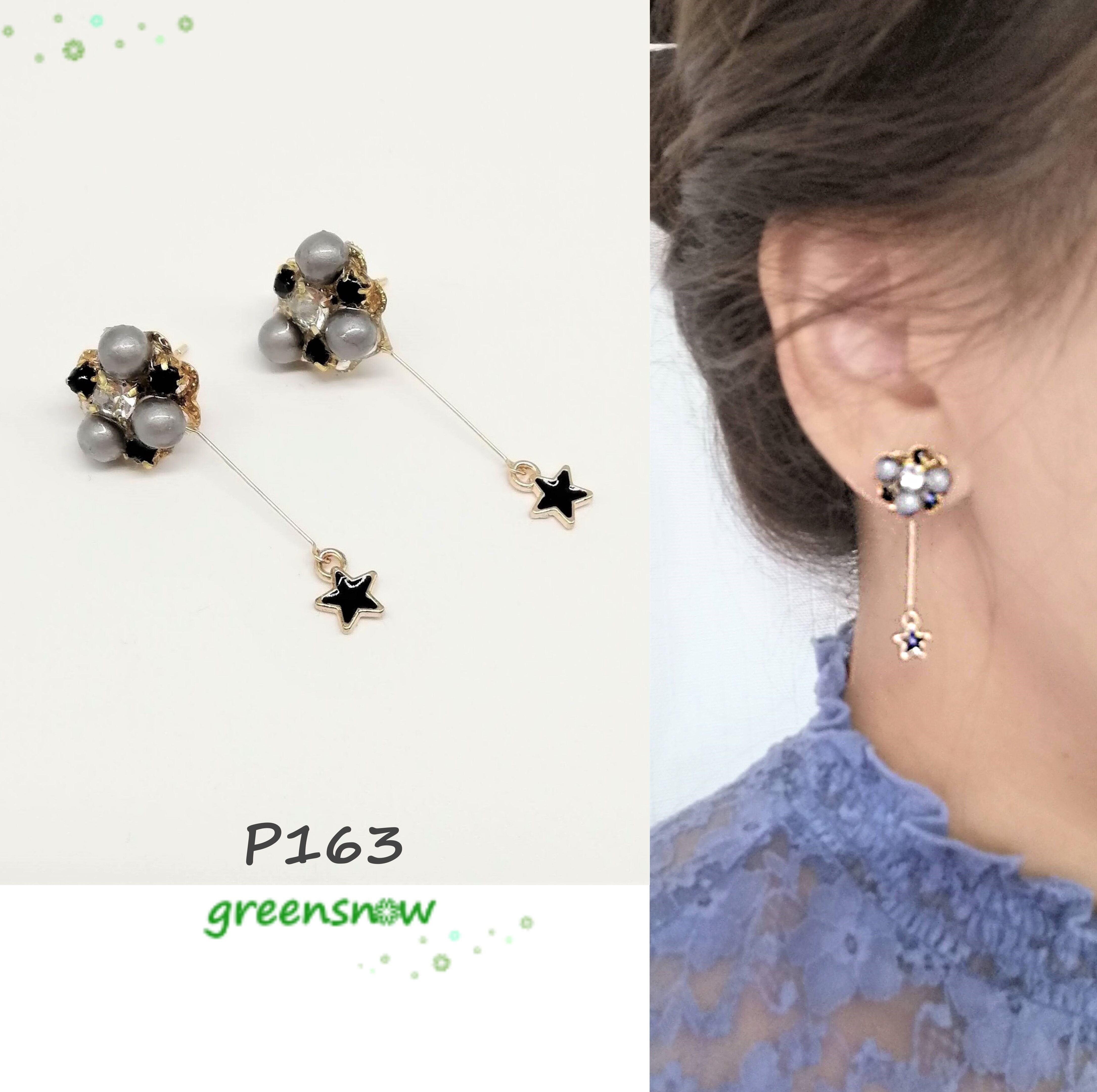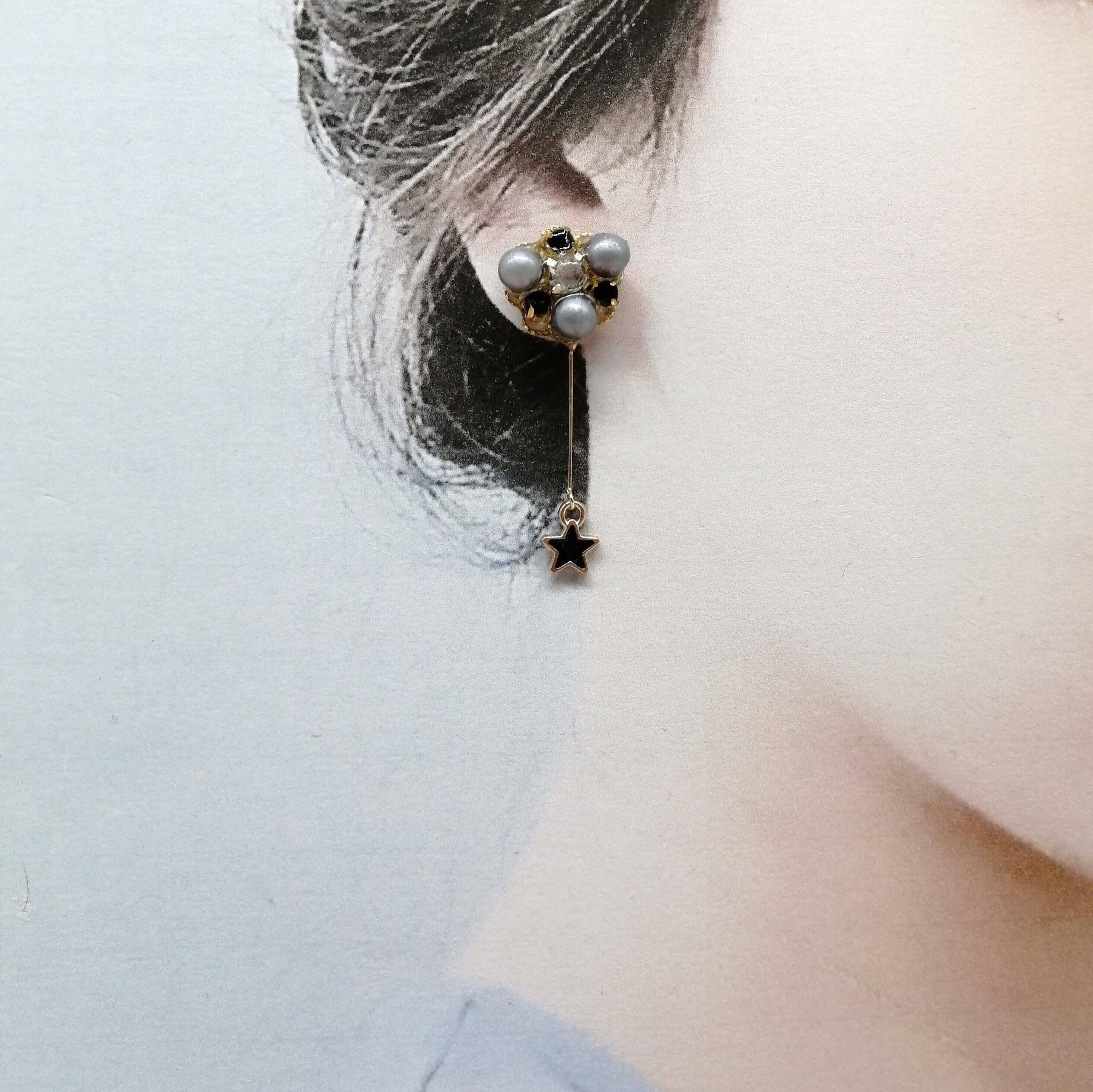 グレー色のパール×ブラック色のストーン×星を合わせたピアスです。