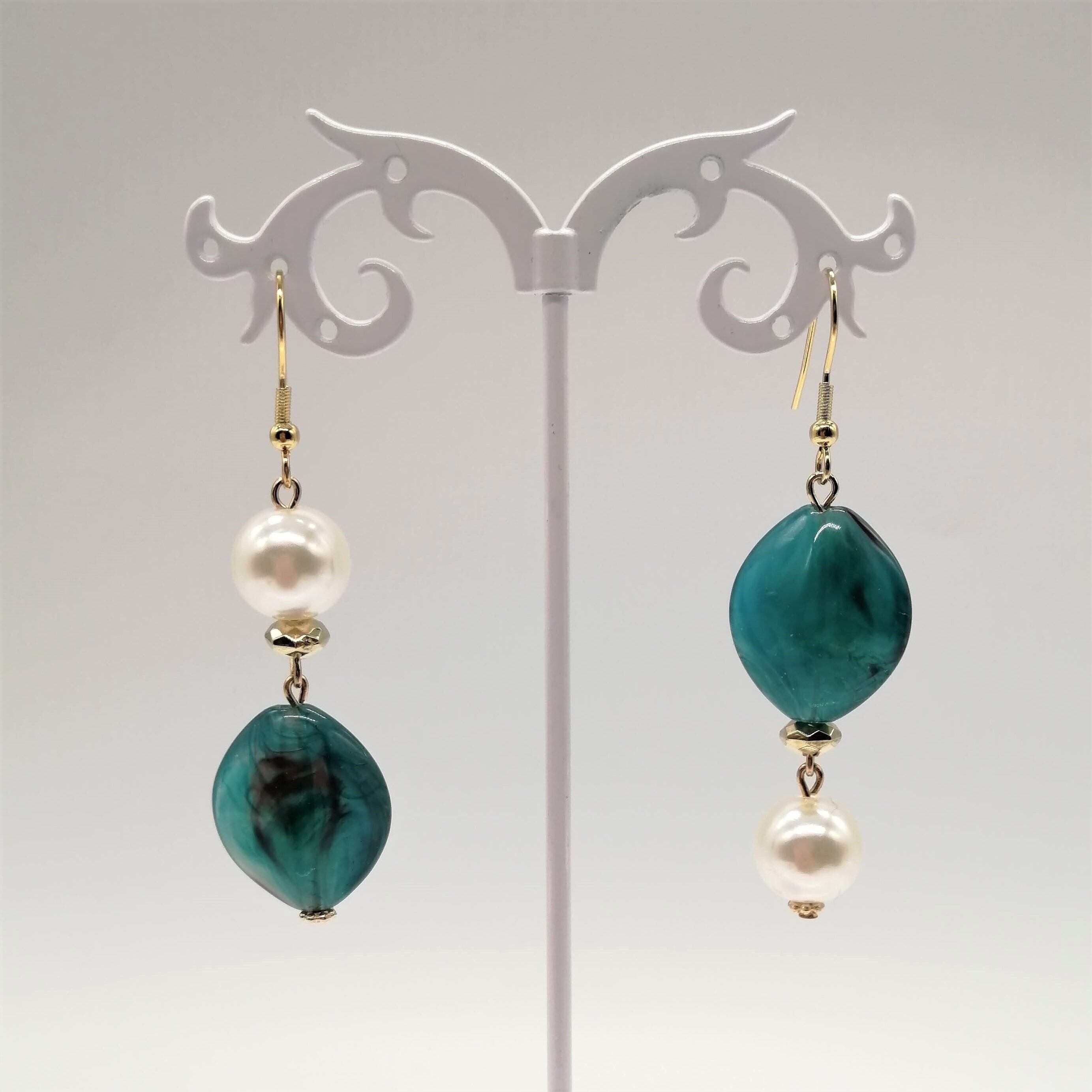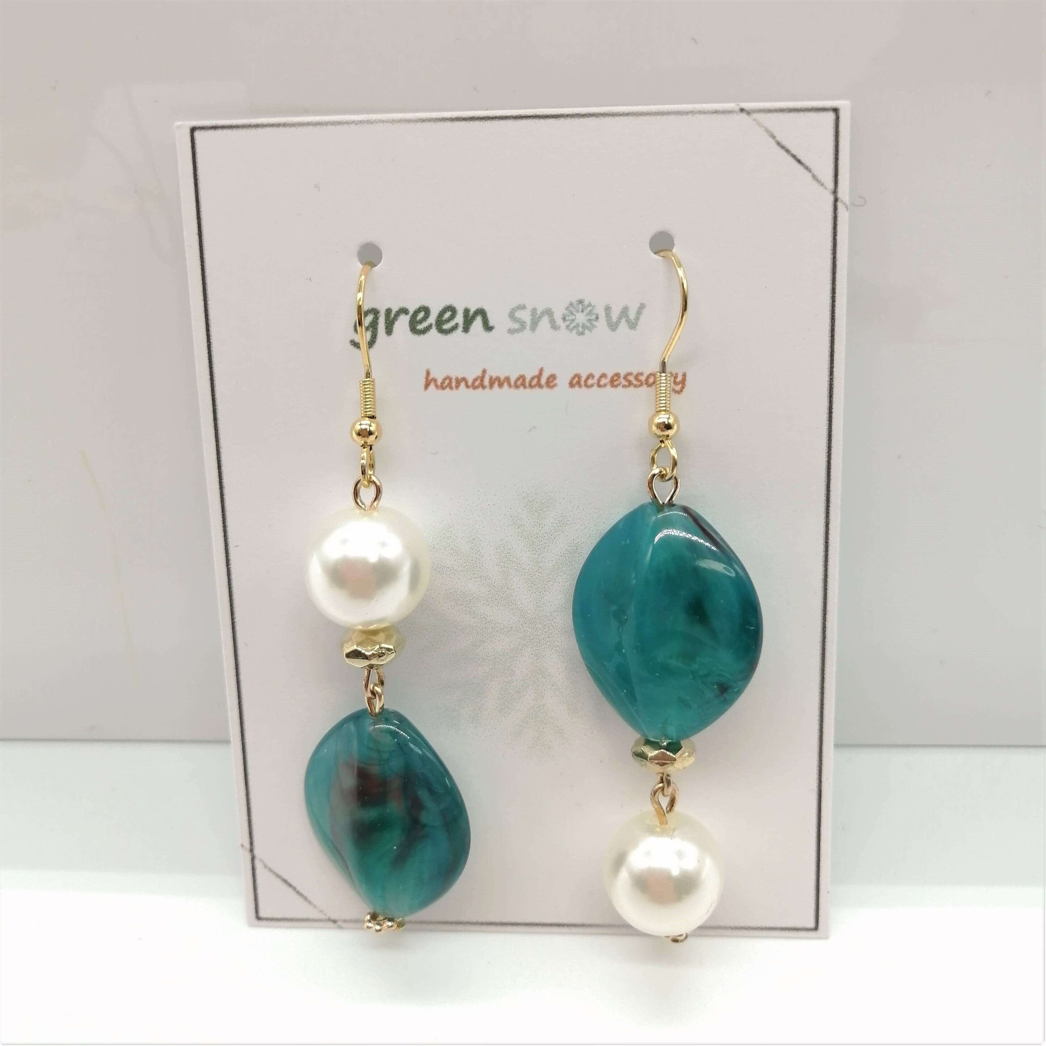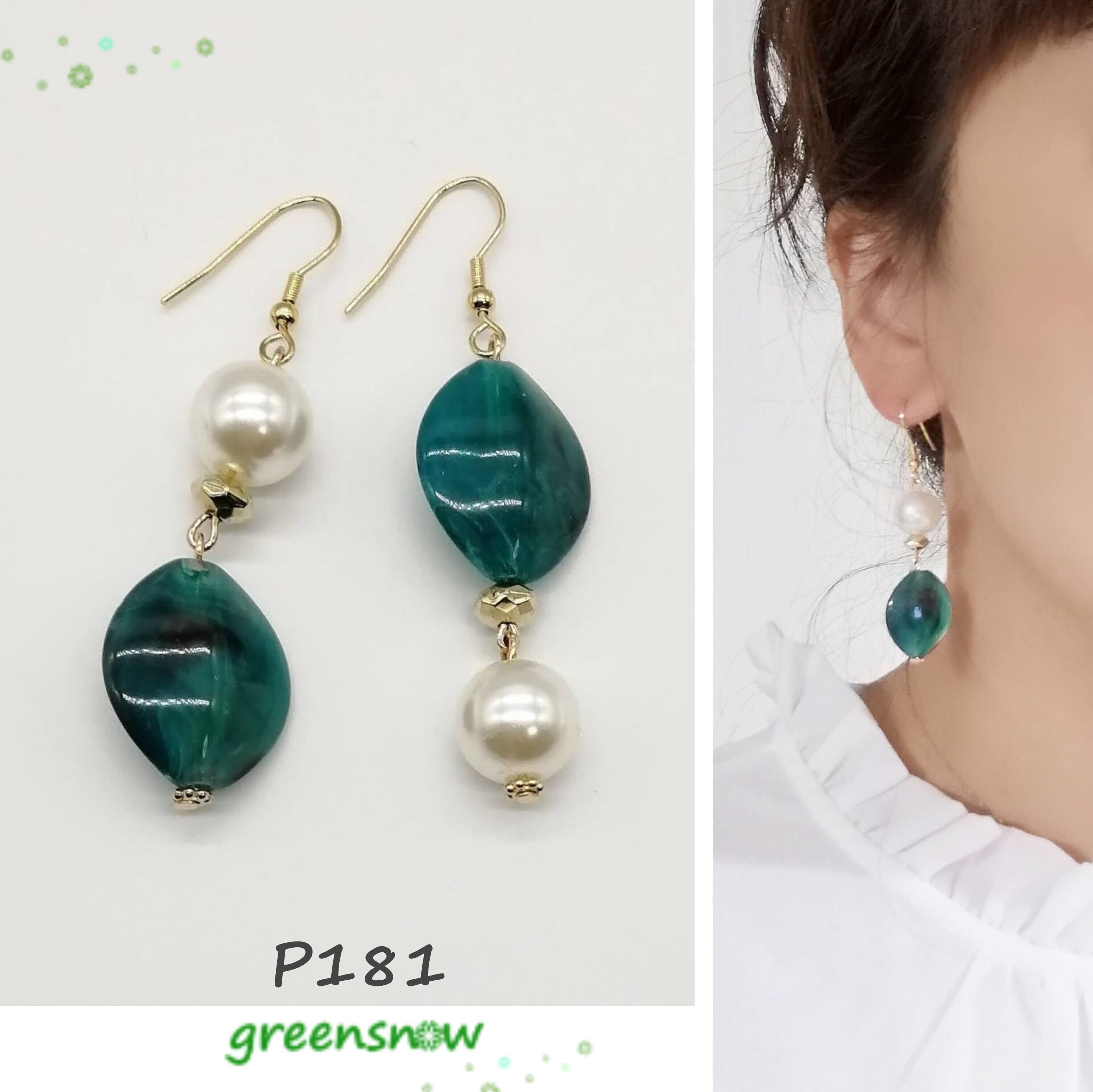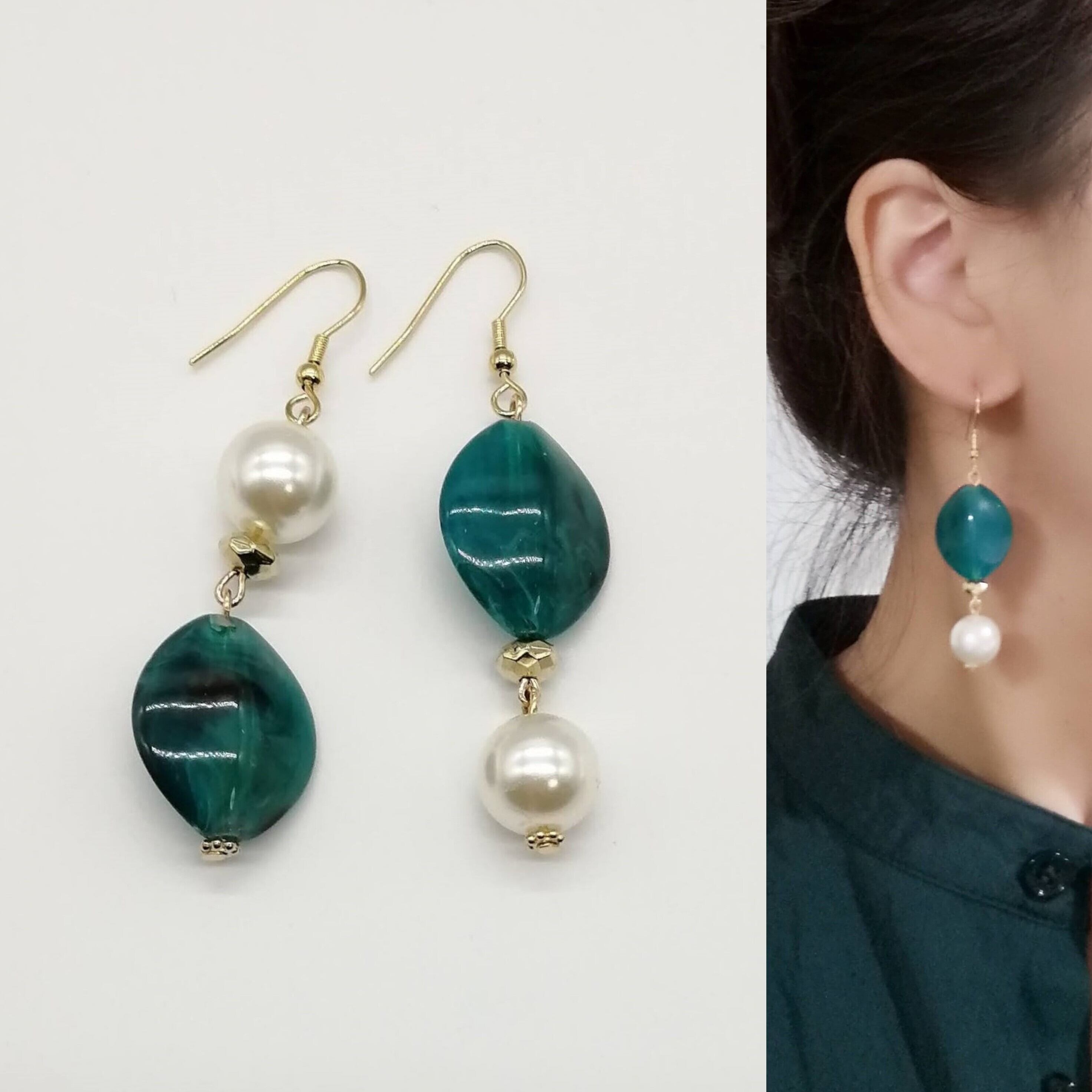 グリーン色のホースアイ×ホワイトパールの組み合わせのピアスです。