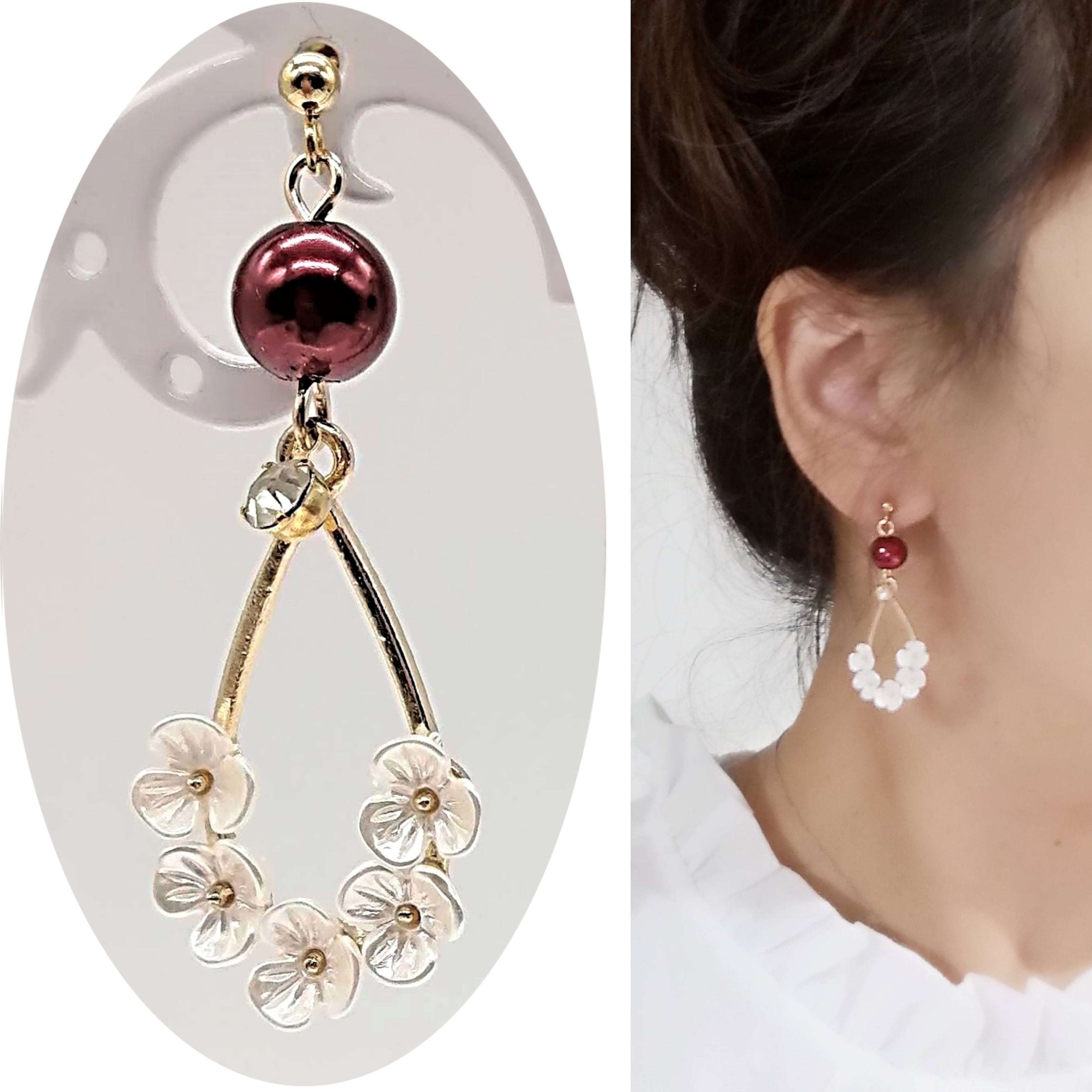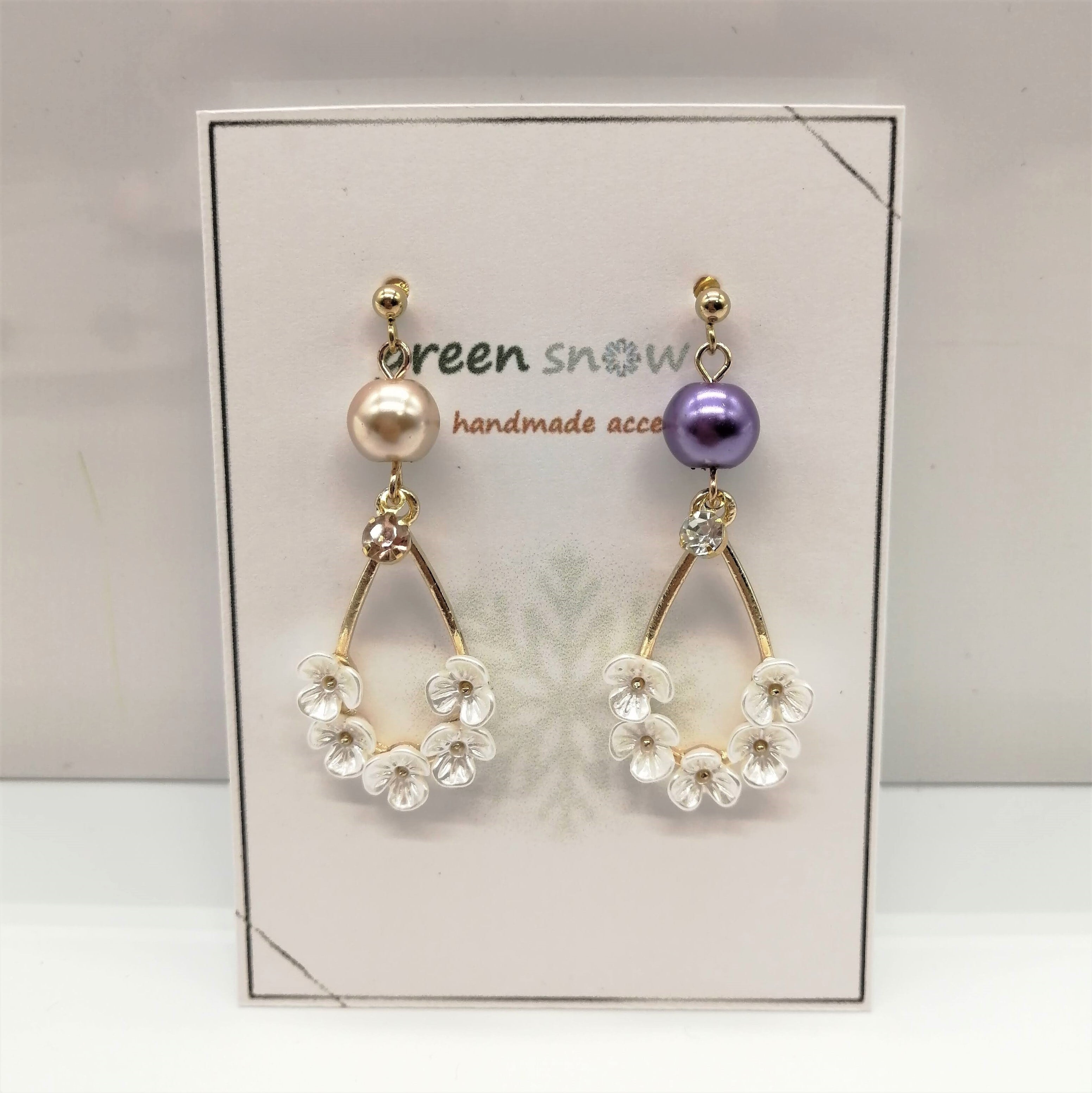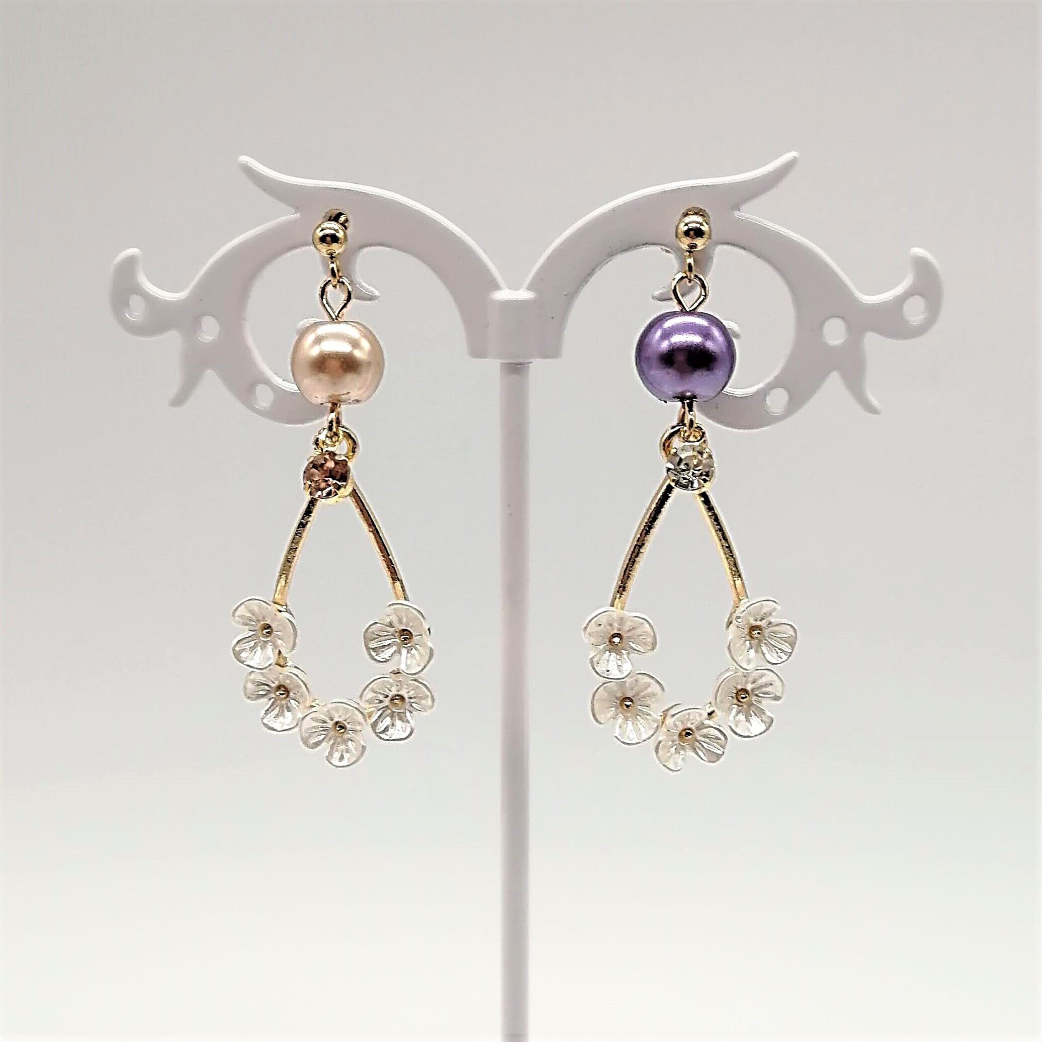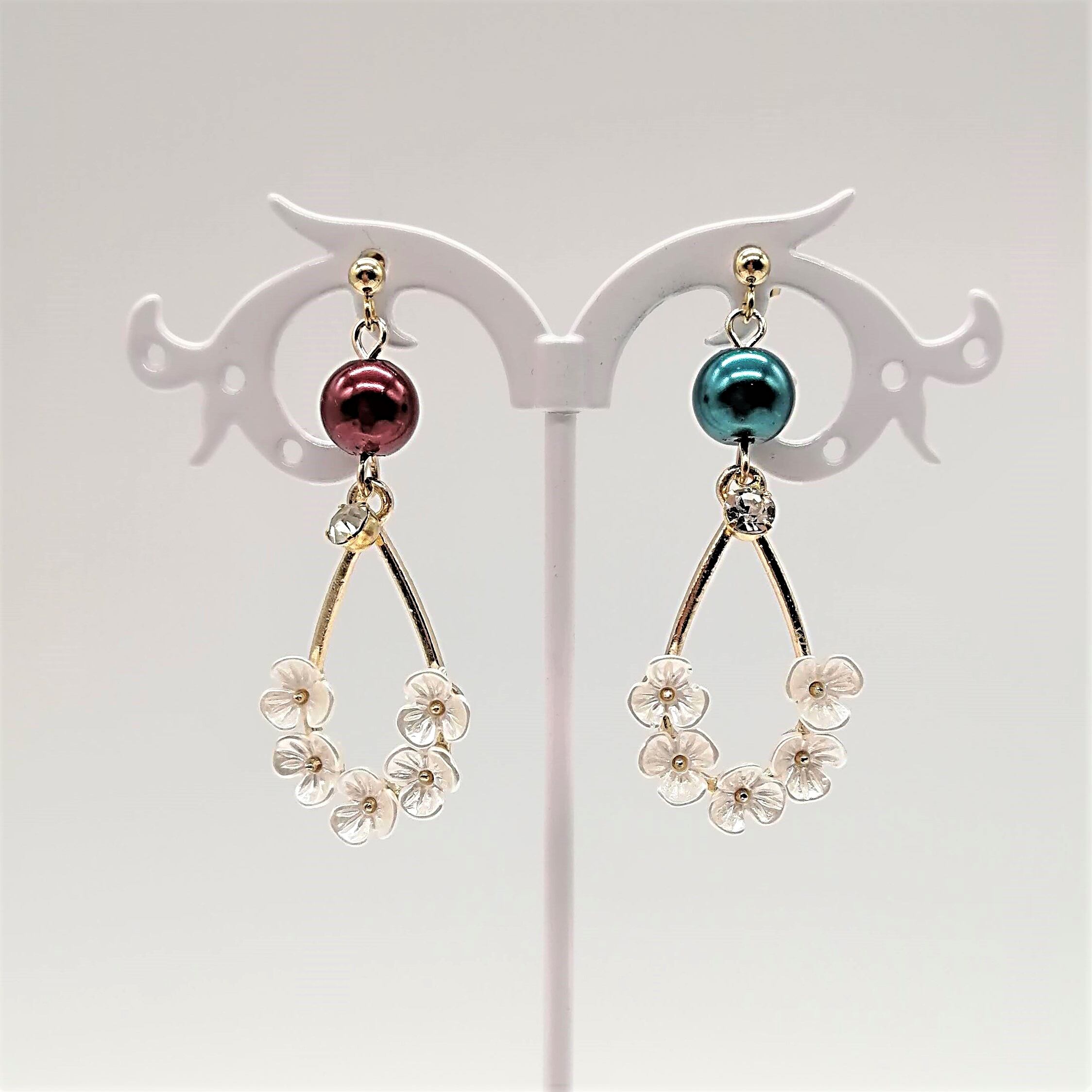 花付きしずく×パールの組み合わせのピアスです。