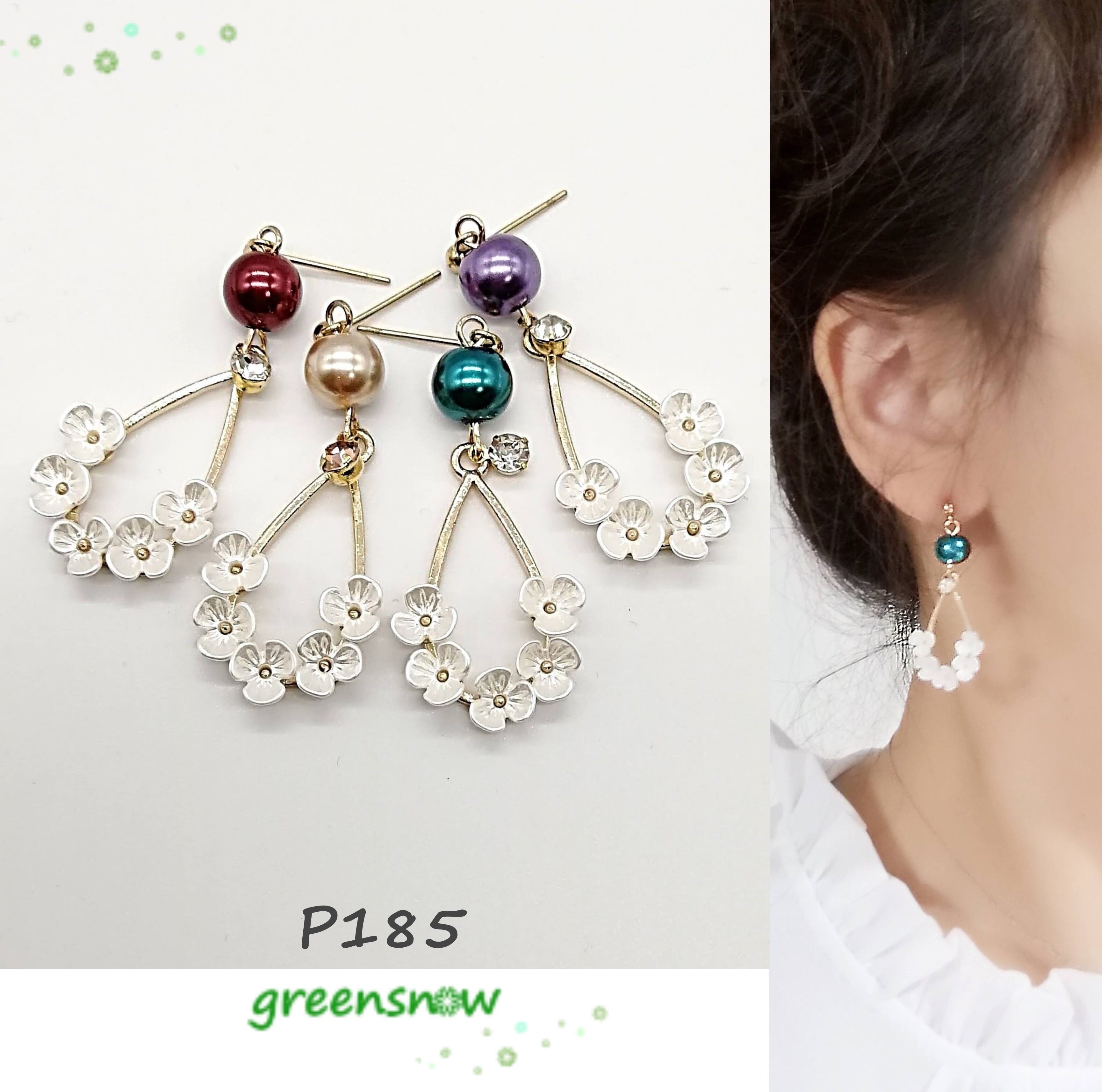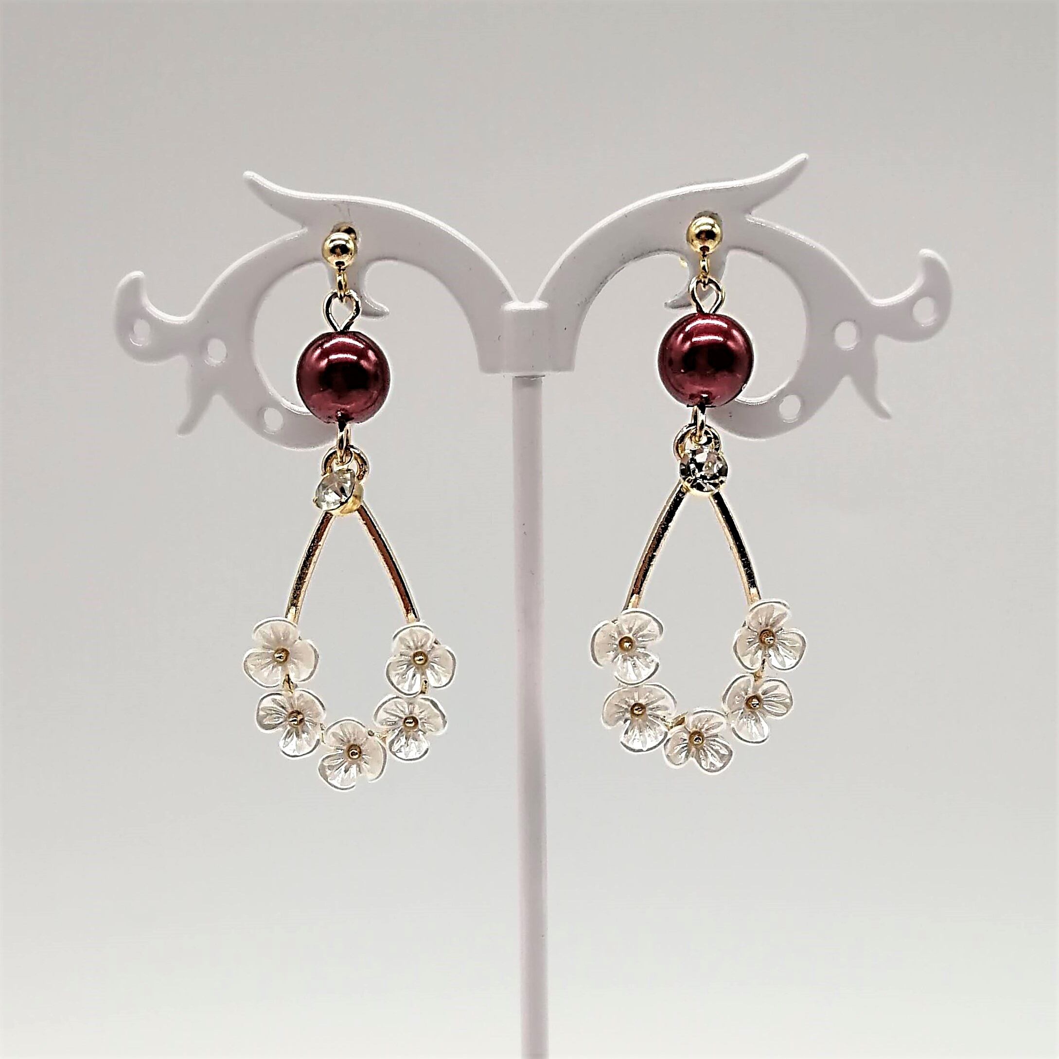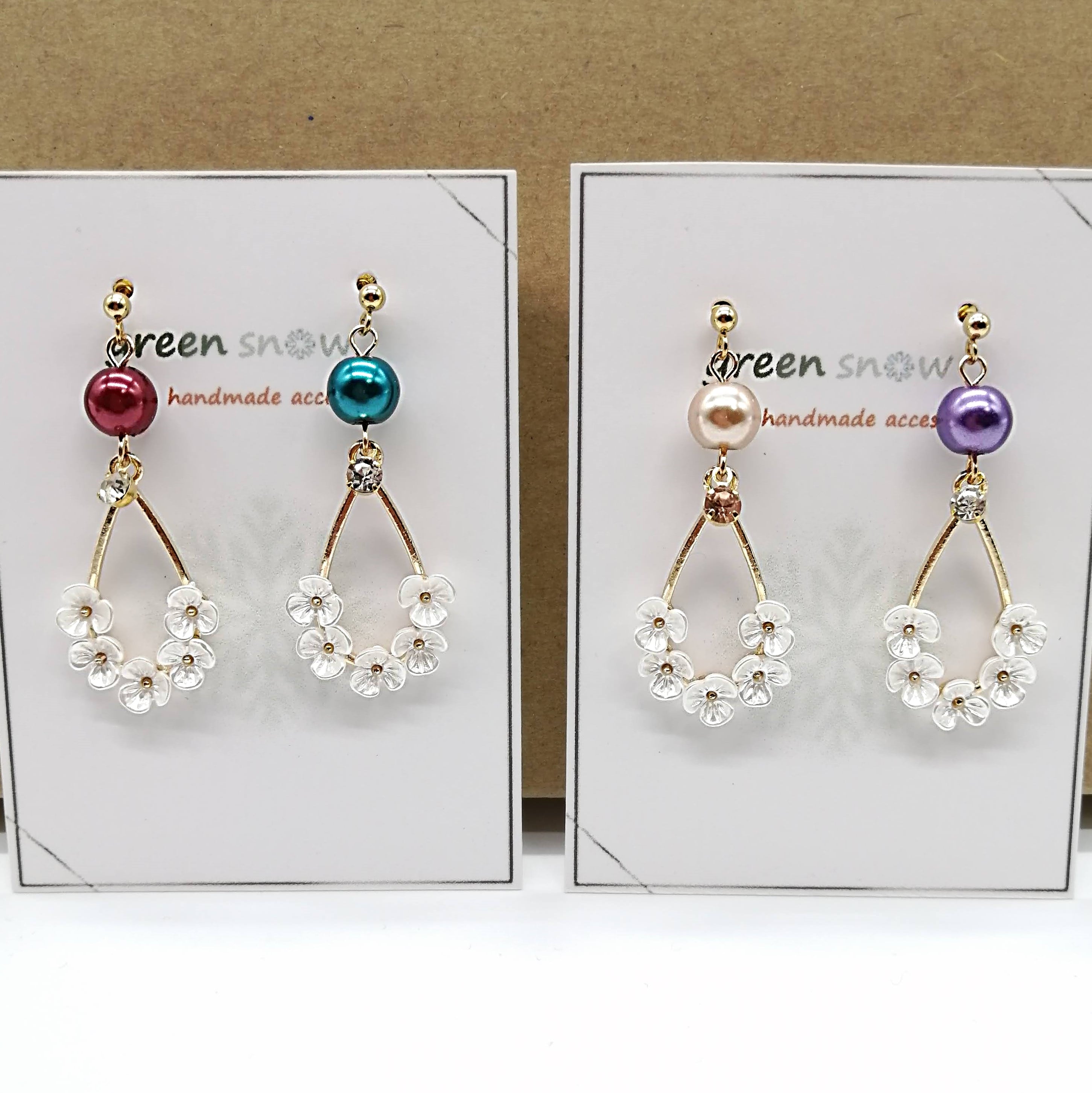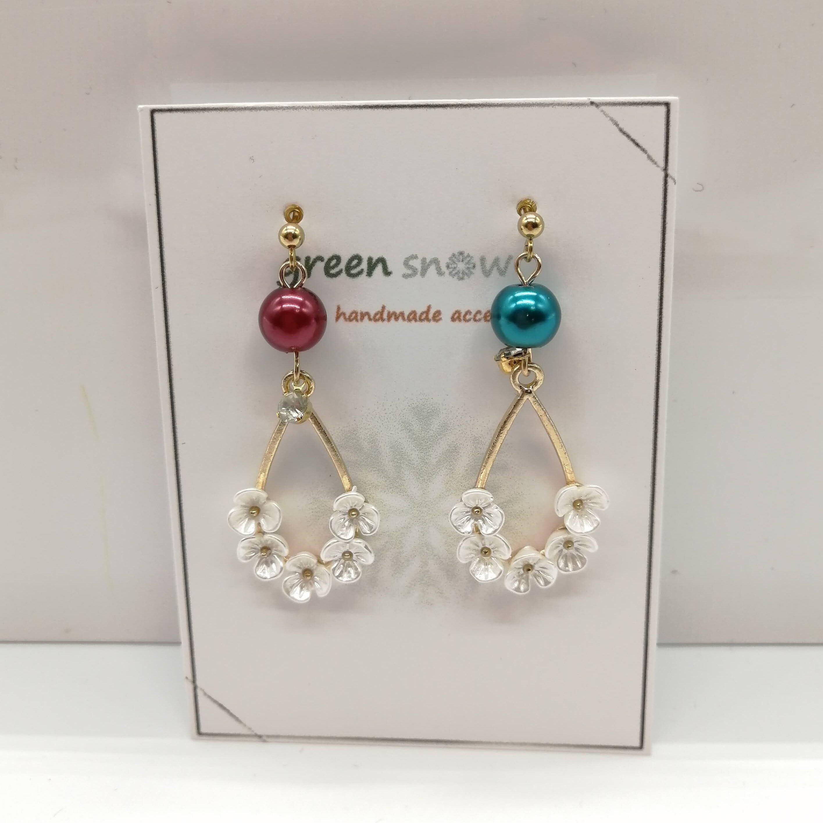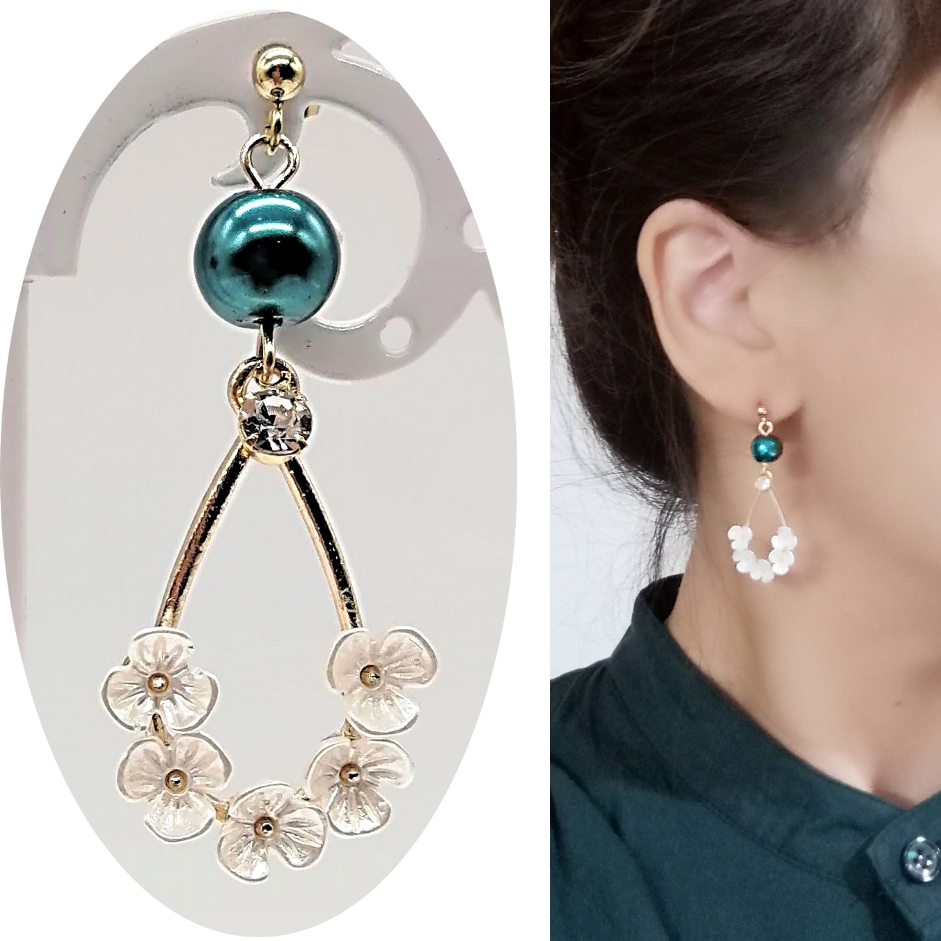 花付きしずく×パールの組み合わせのピアスです。