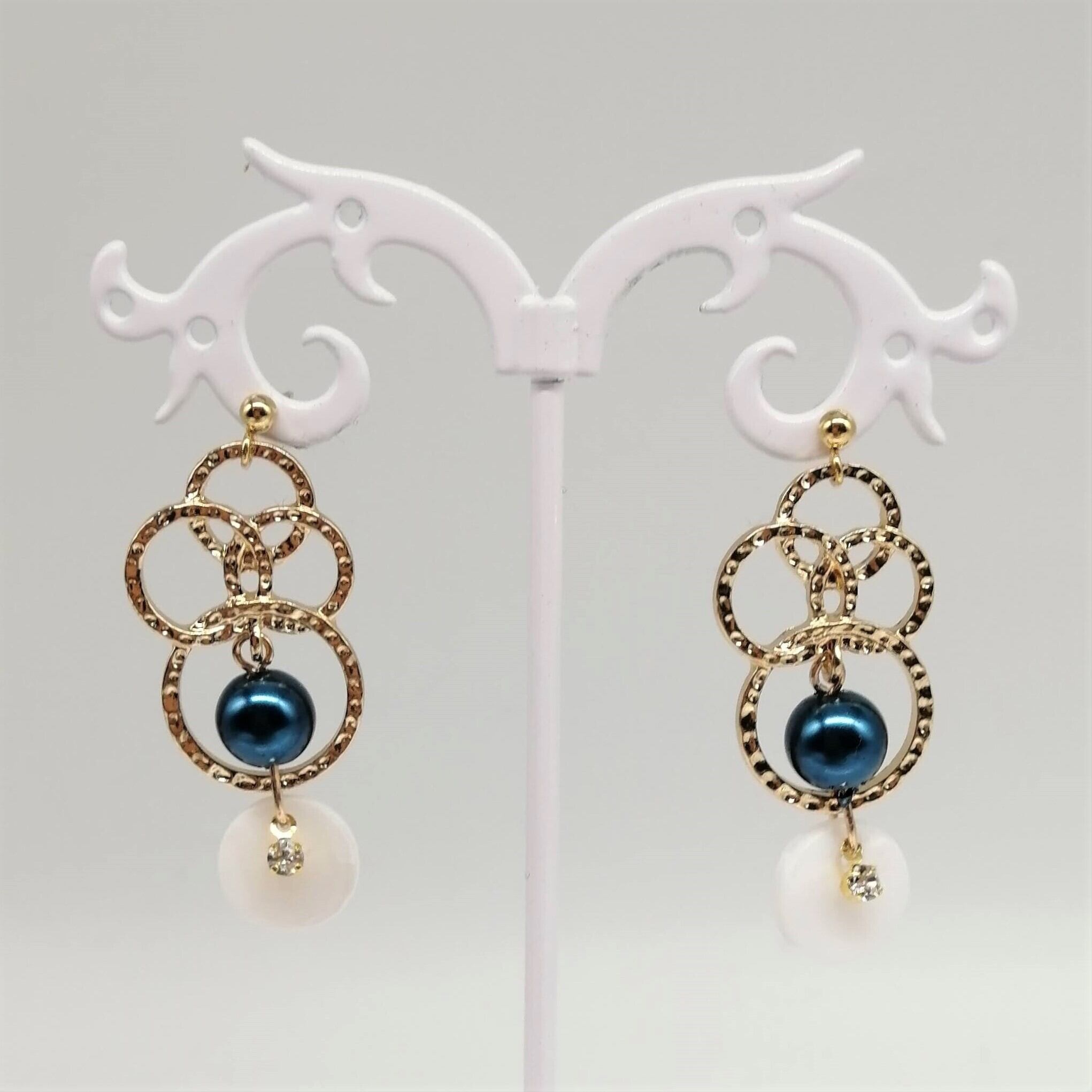【サージカルステンレス ピアス】4連リング ブルー レッド パール シェル ストーン イヤリング