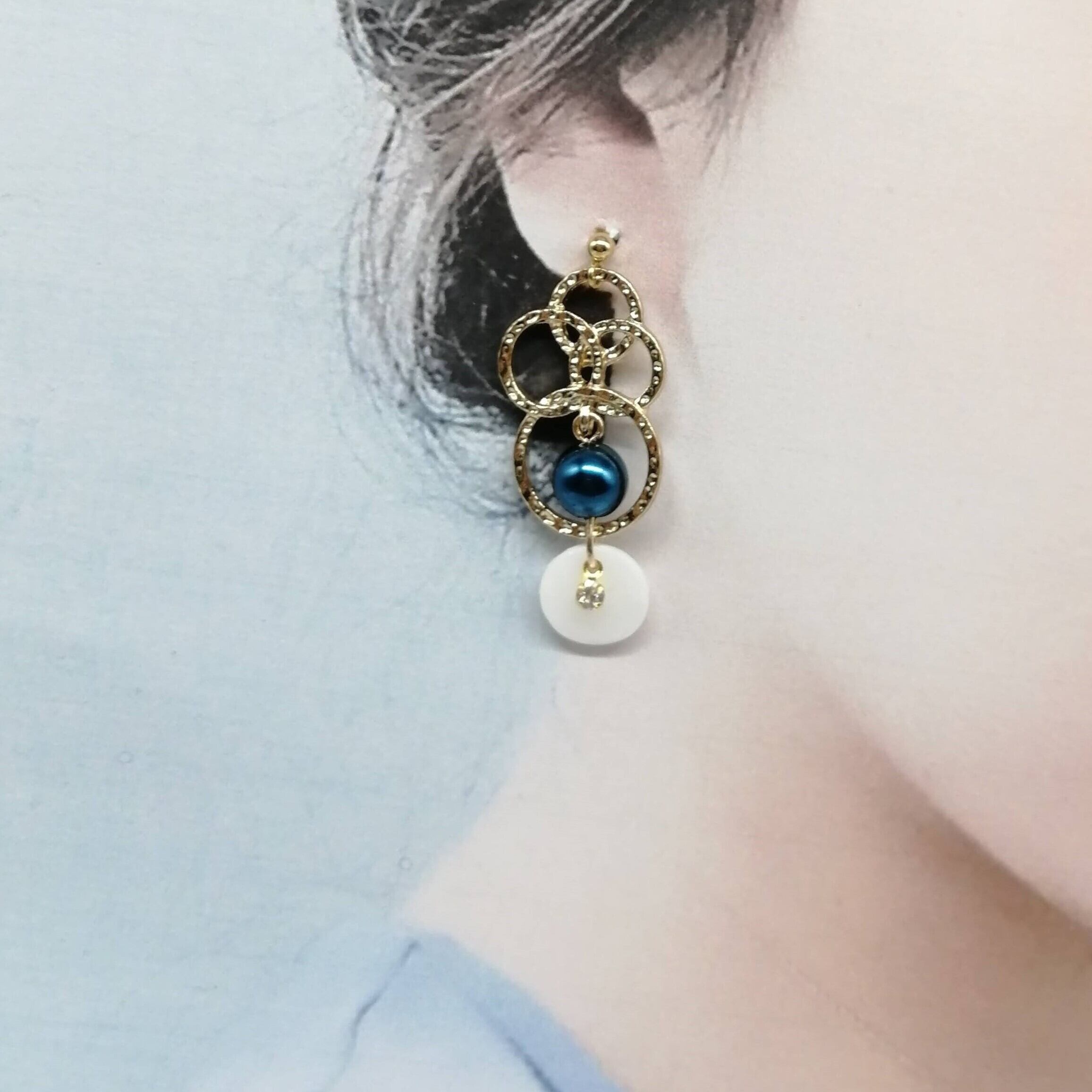 4連リング×パール×シェルのラウンド×ストーンをあわせたピアスです。