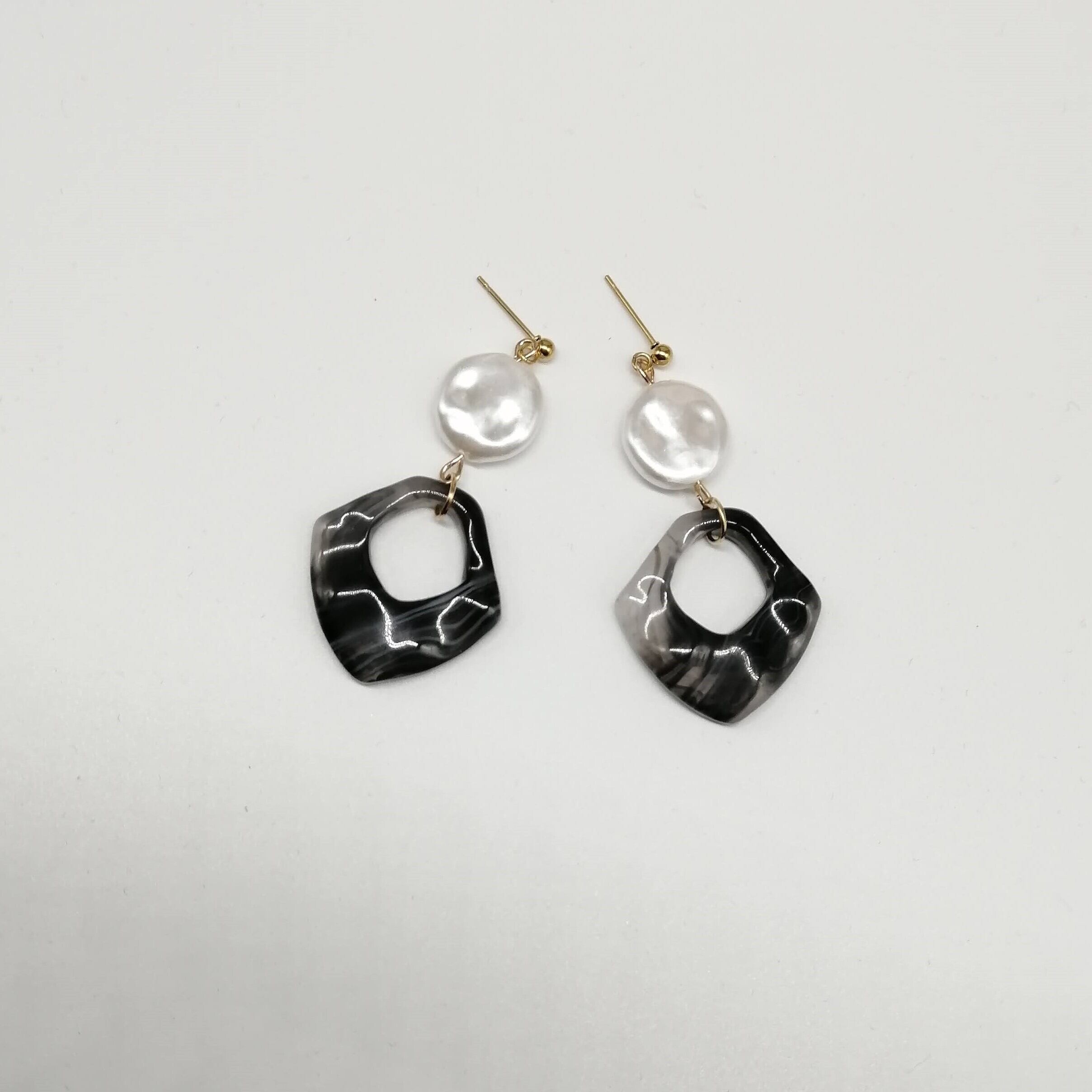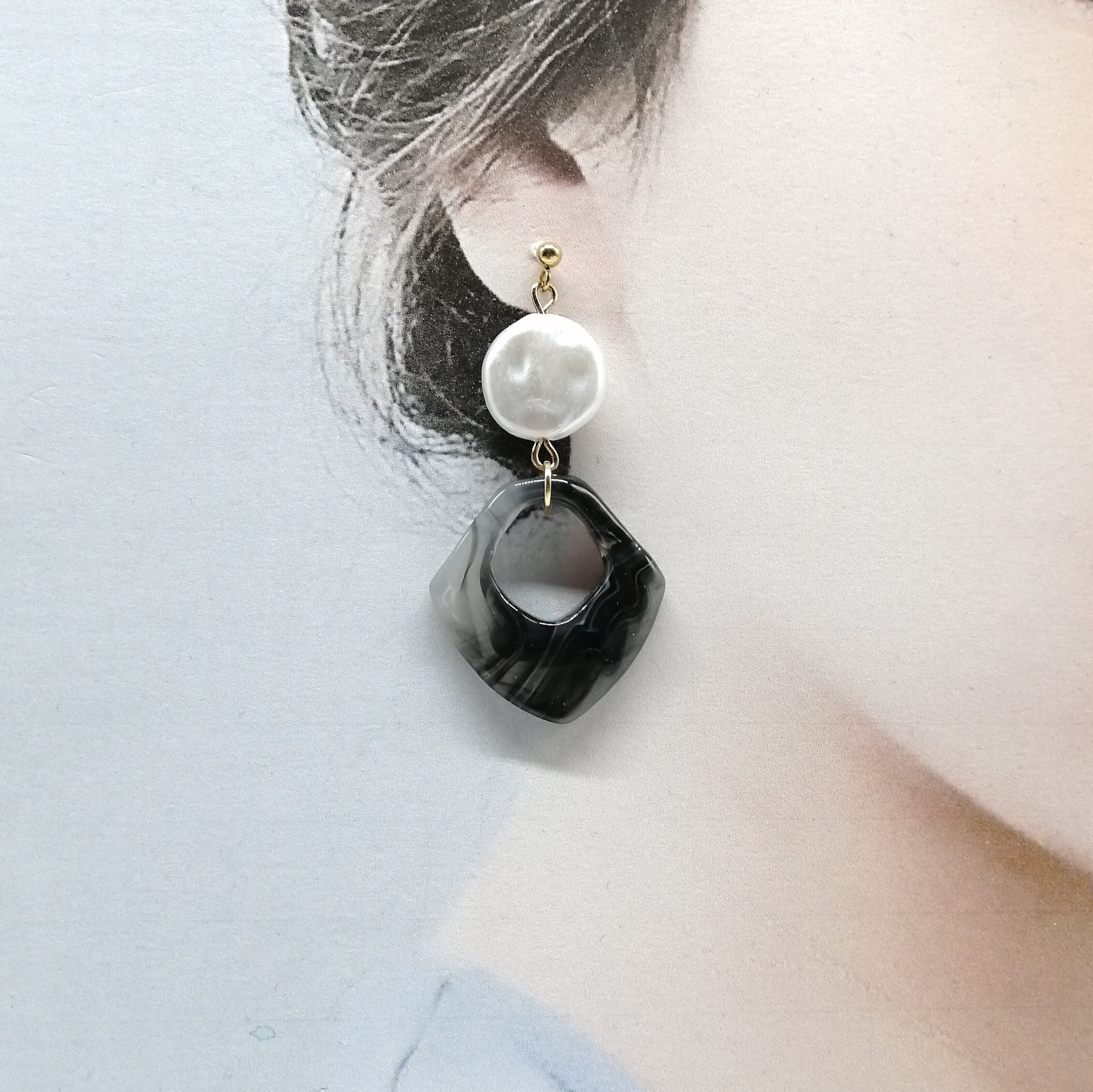 コイン型パール×波型のひし形マーブルをあわせたピアスです。