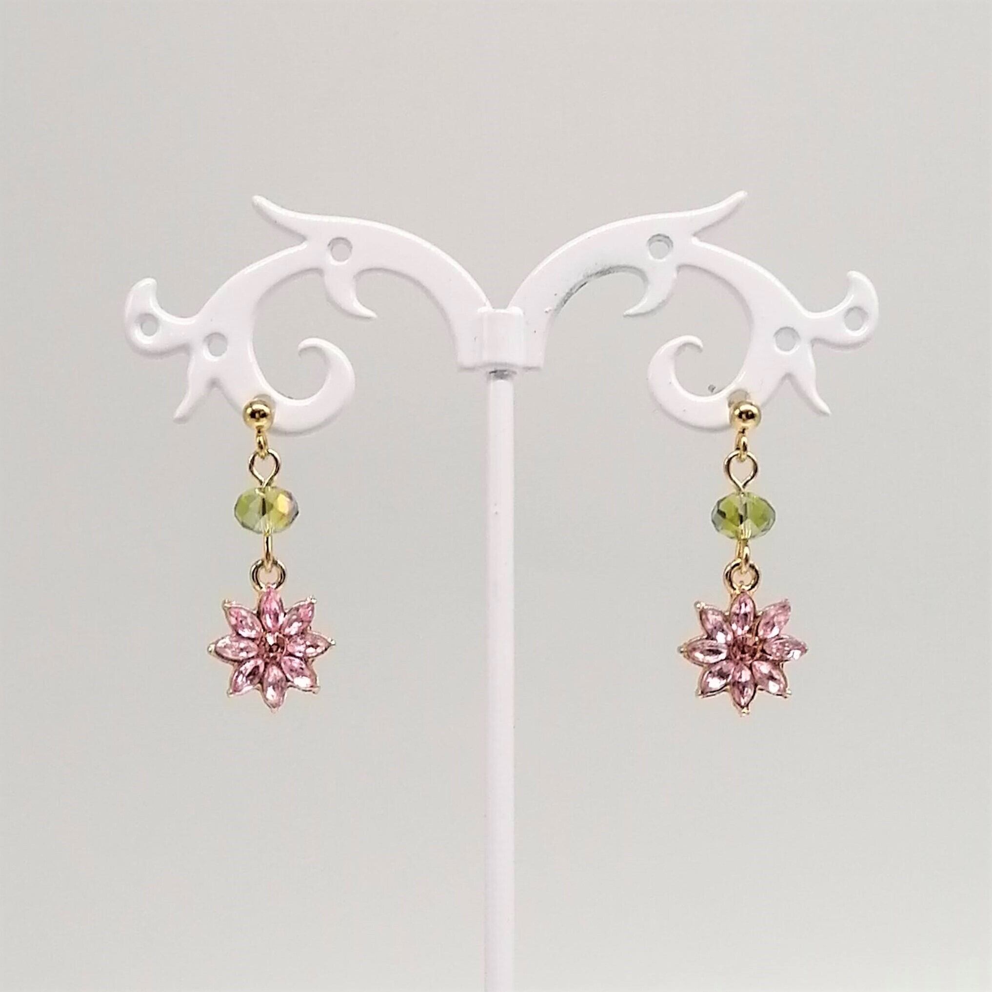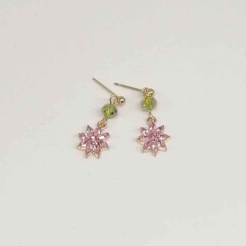 ライトグリーン色の変形ガラスストーン×A級ガラスストーン使用のピンクフラワーチャームを合わせたピアスです。