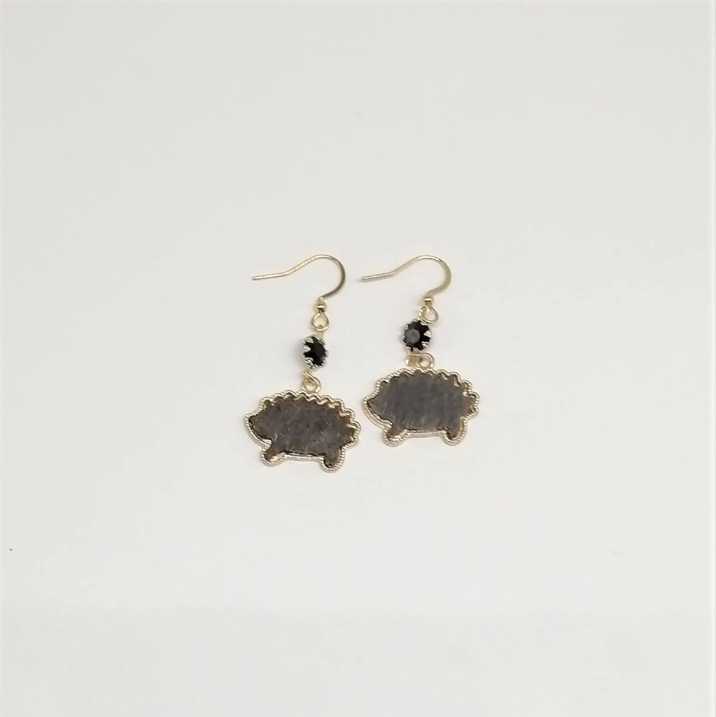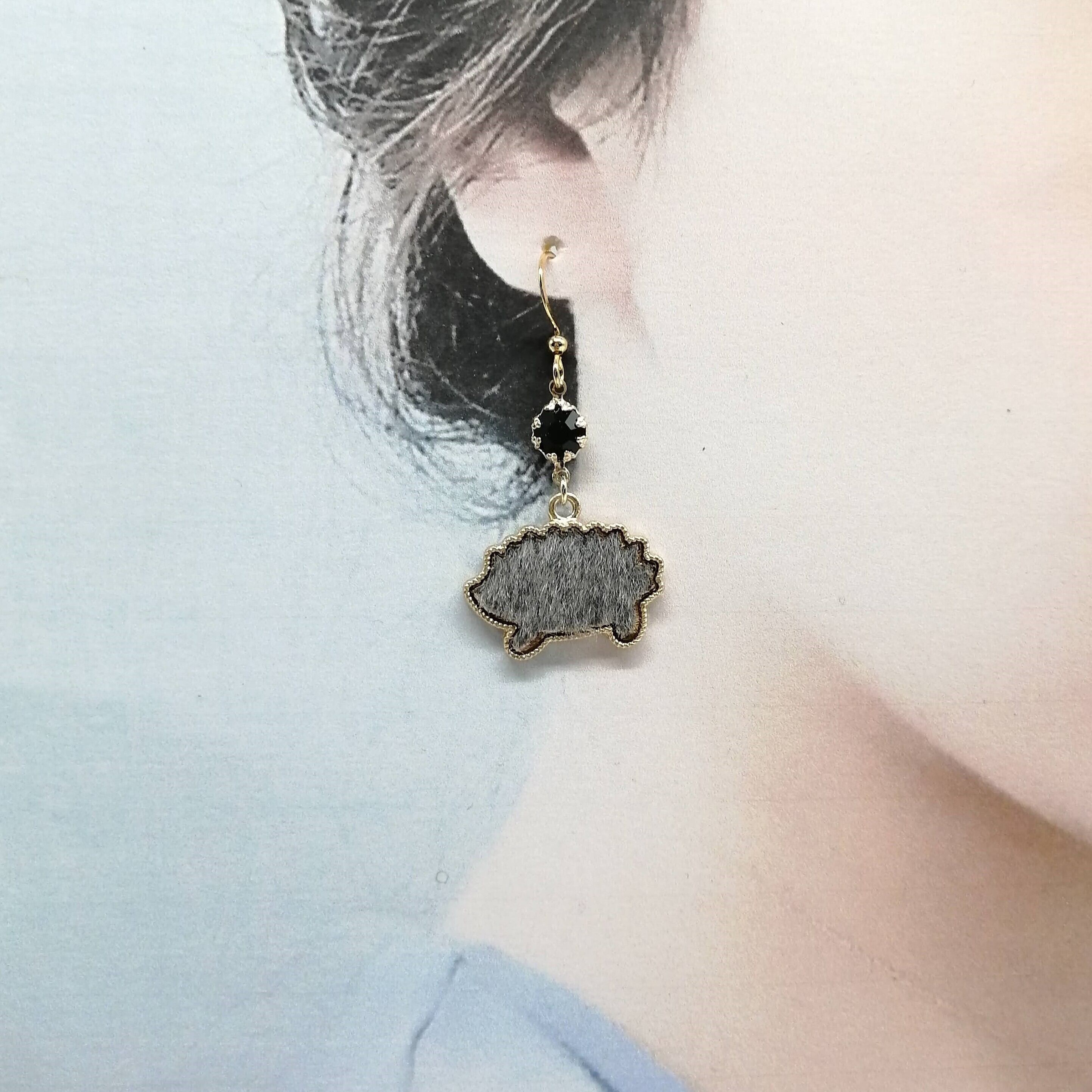 ブラックのカット面ガラス×グレー色のハリネズミを合わせたピアスです。