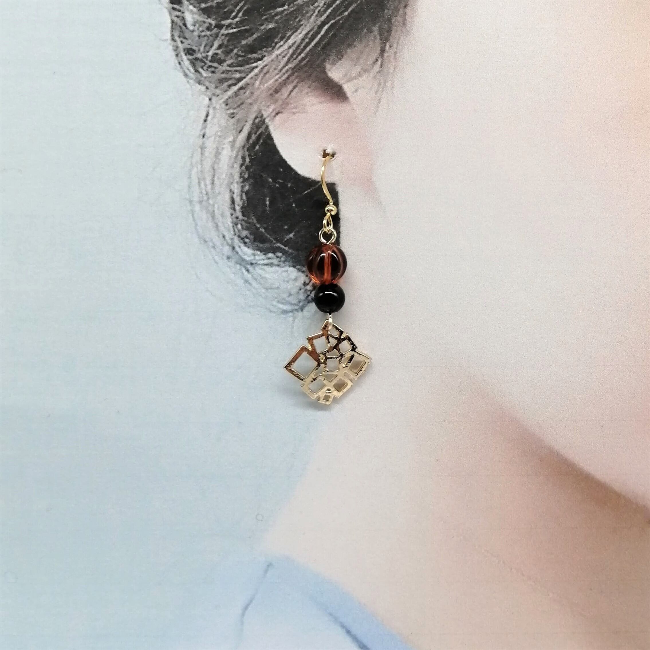 メロンビーズ×黒ビーズ×四角フレームをあわせたピアスです。