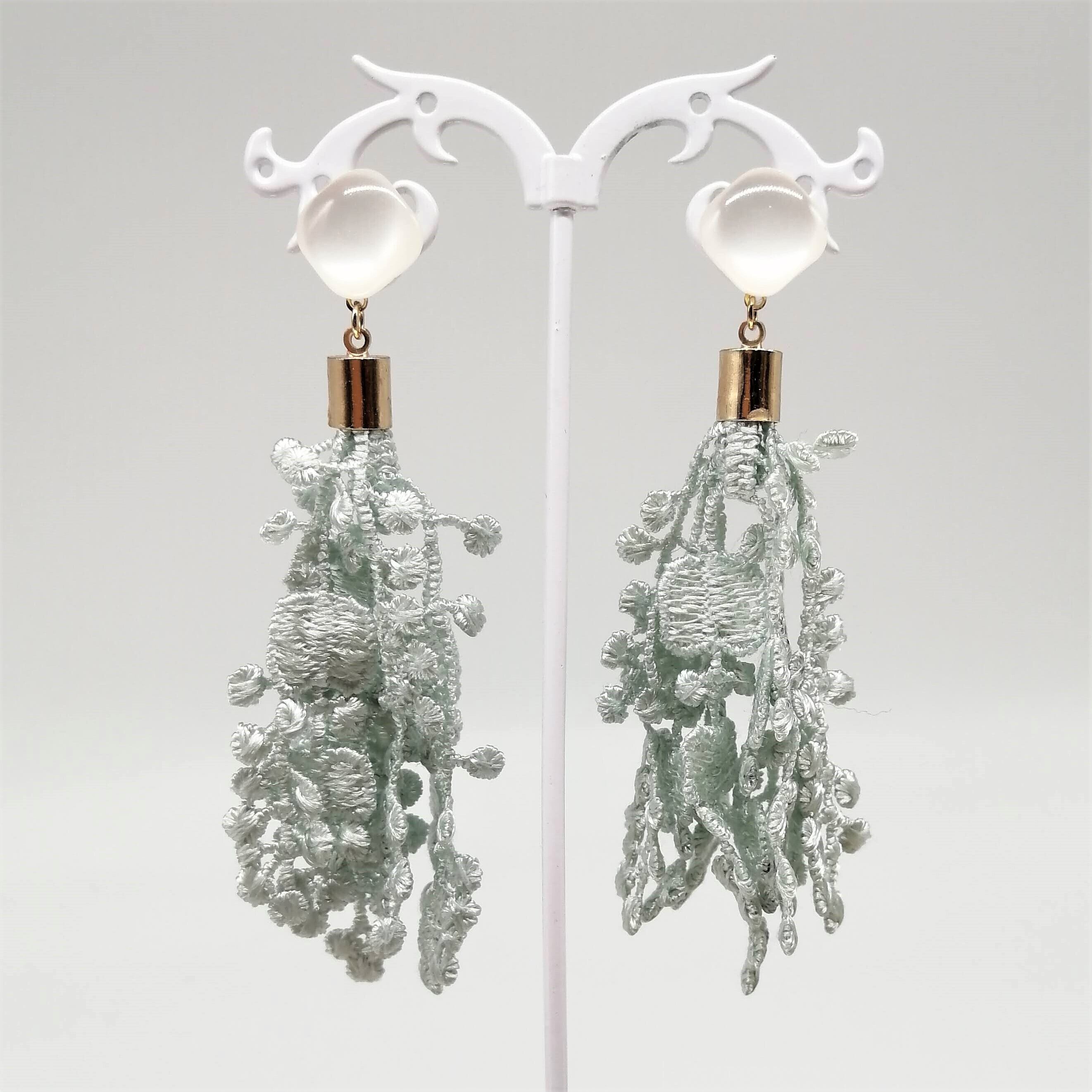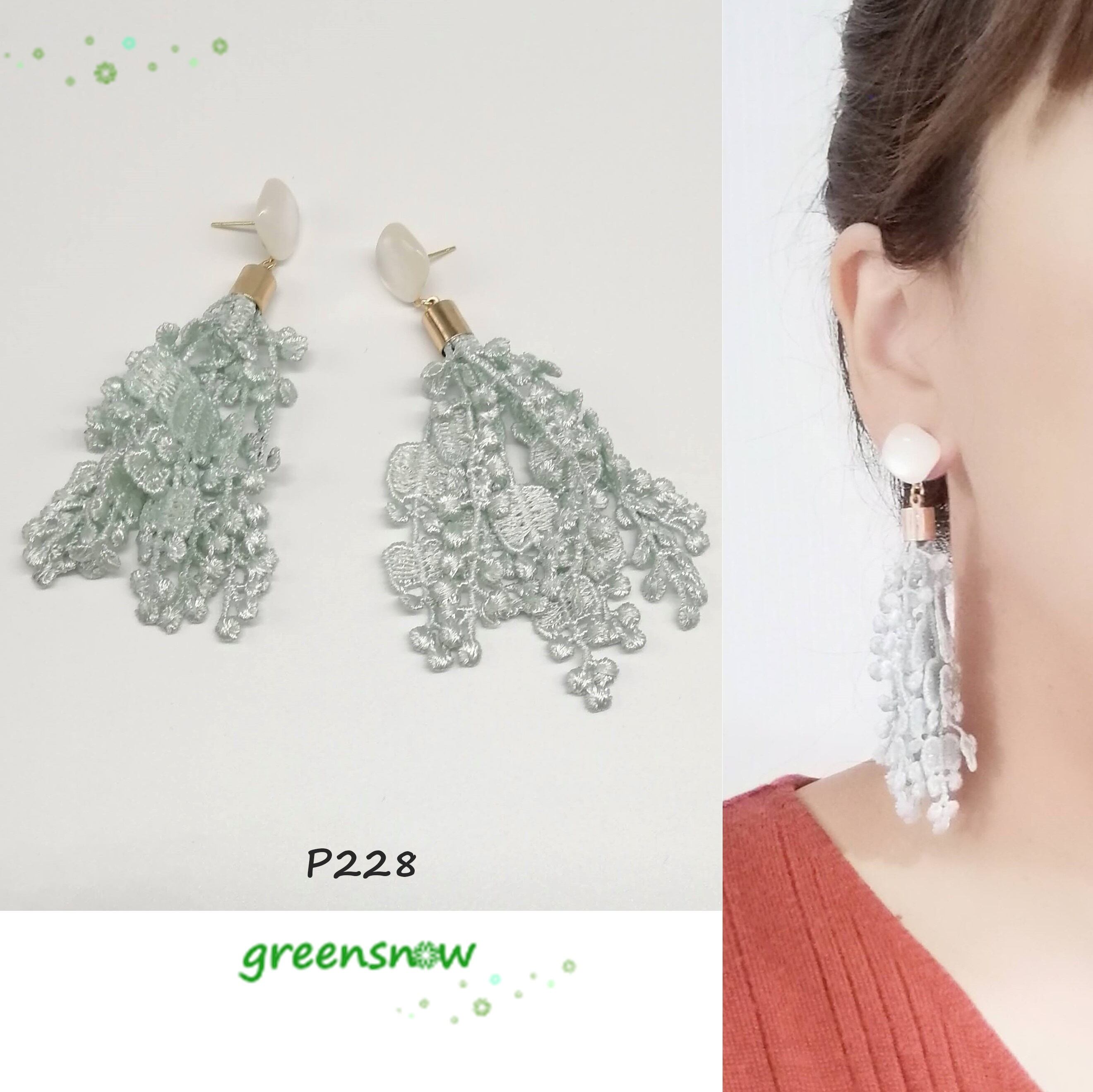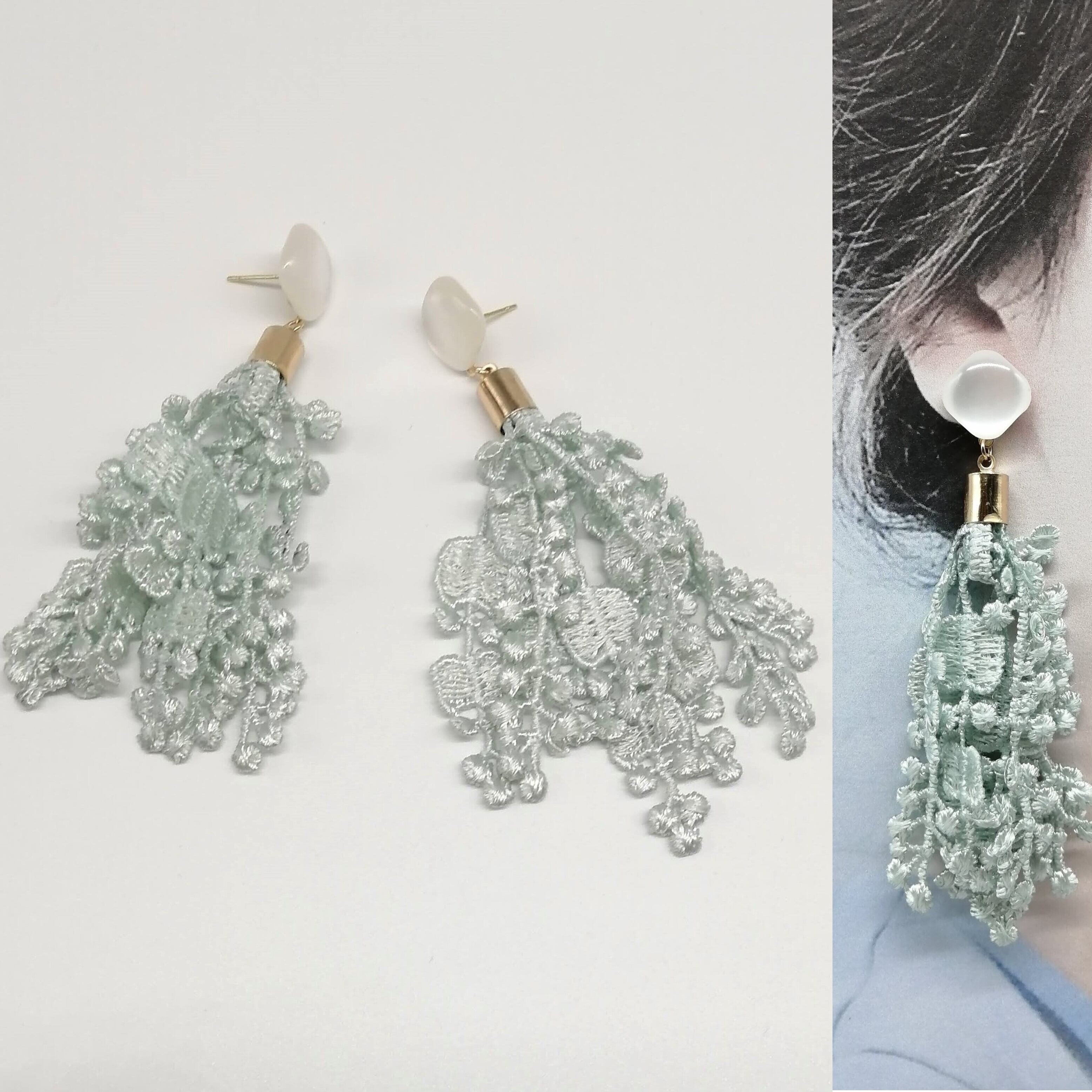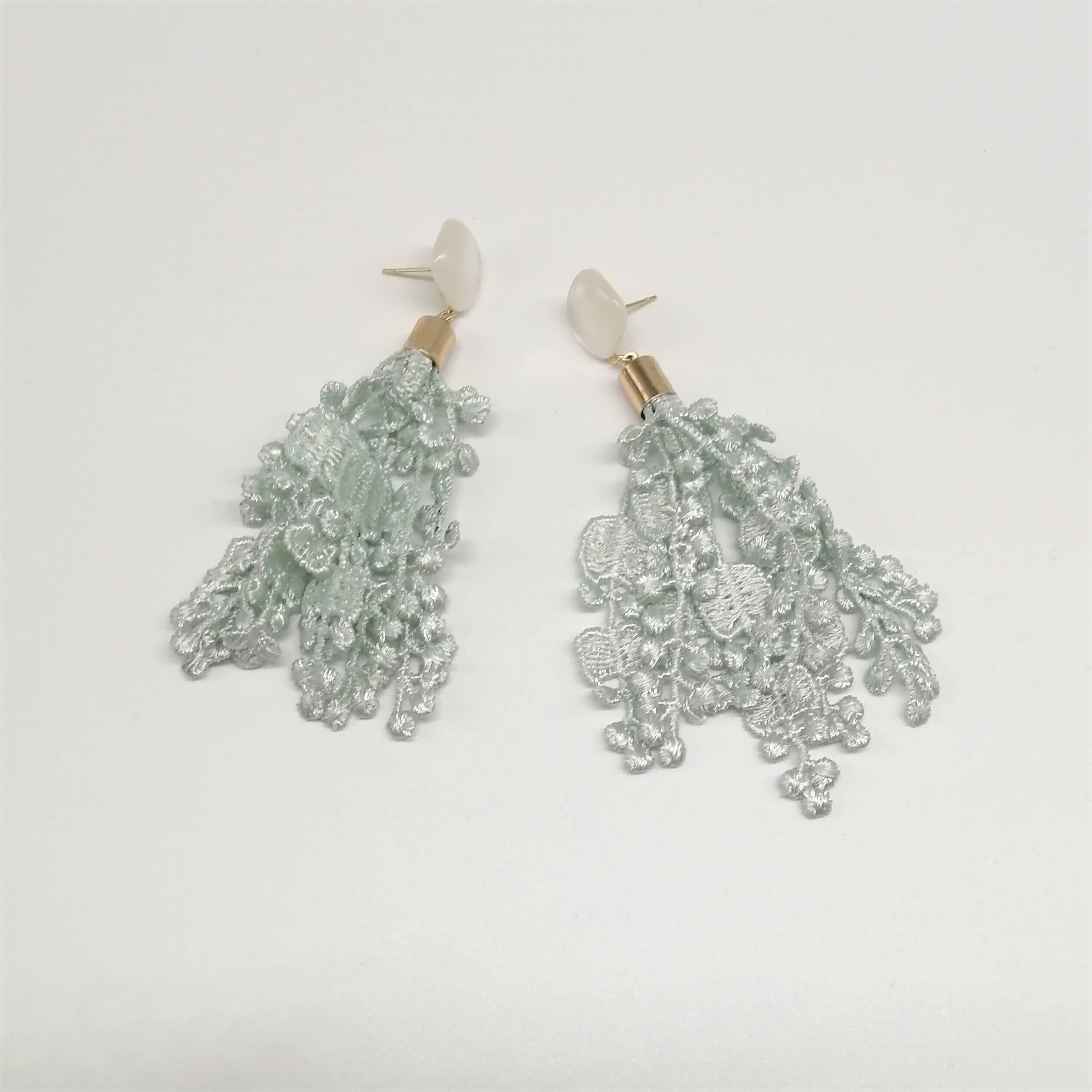 コイン型パール×ライトブルー色のタッセルを合わせたピアスです。