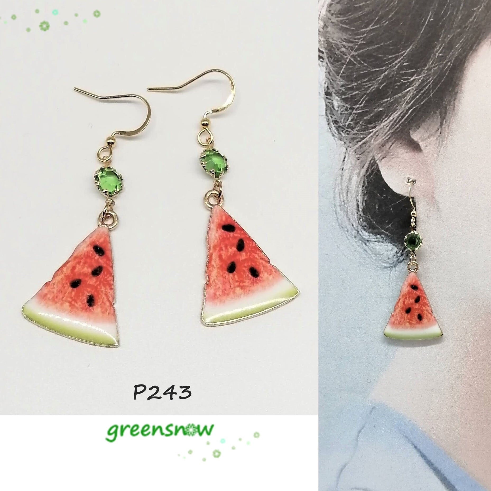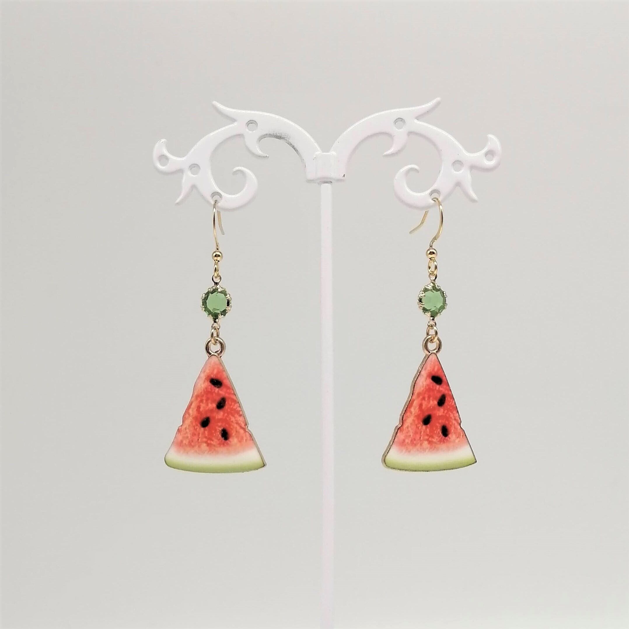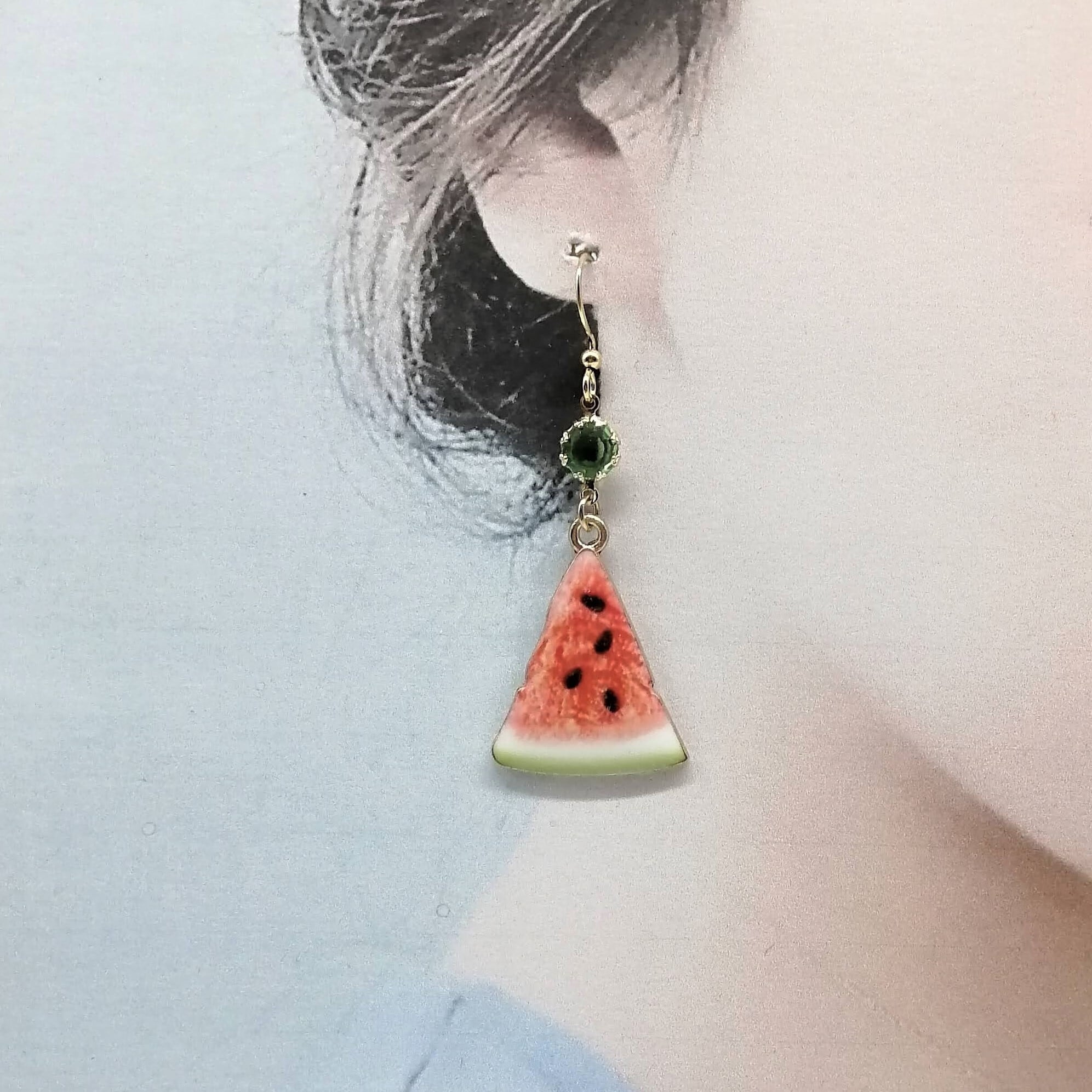 【サージカルステンレス ピアス】カット面ガラス スイカ 赤 夏 果物 イヤリング