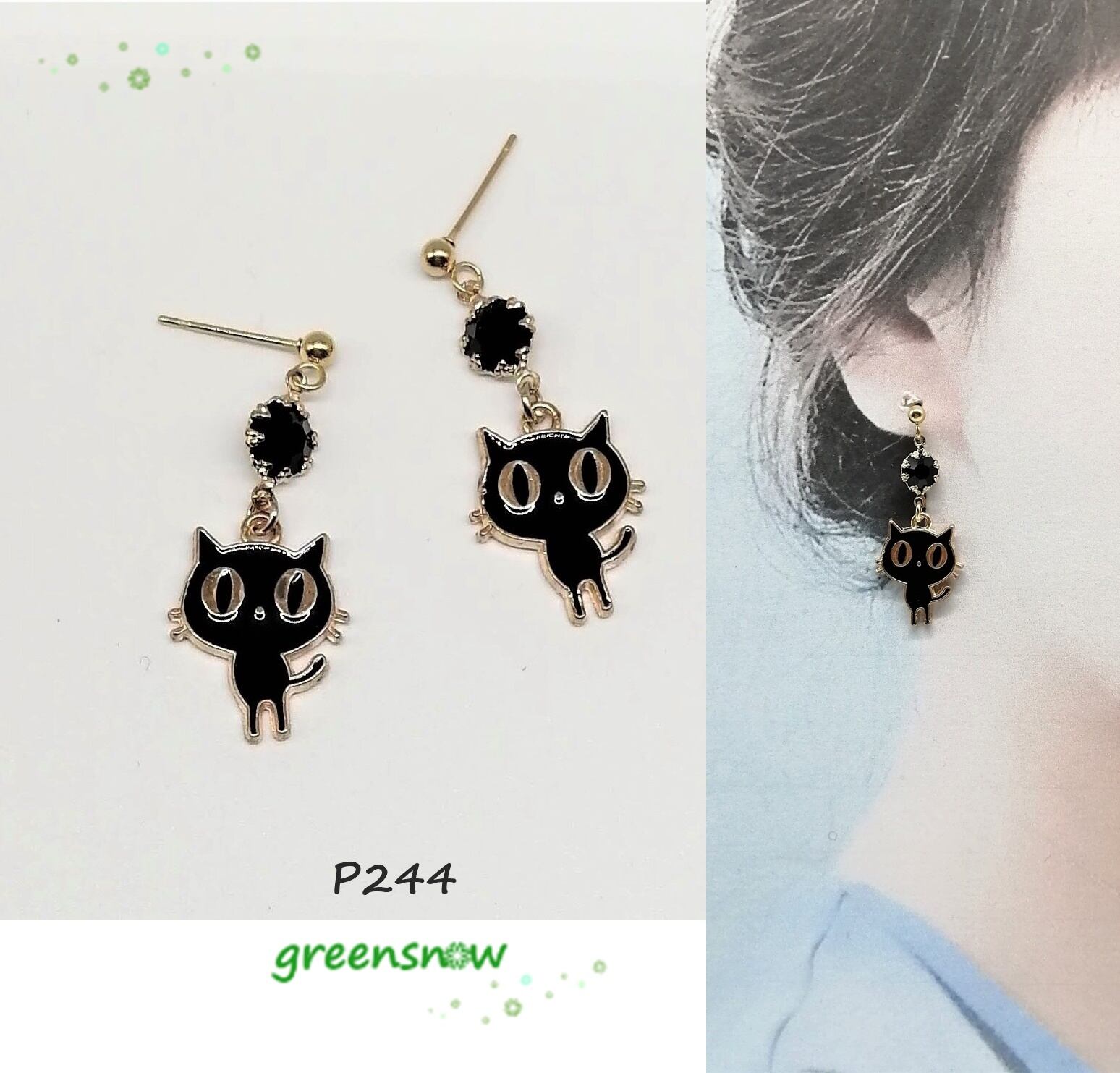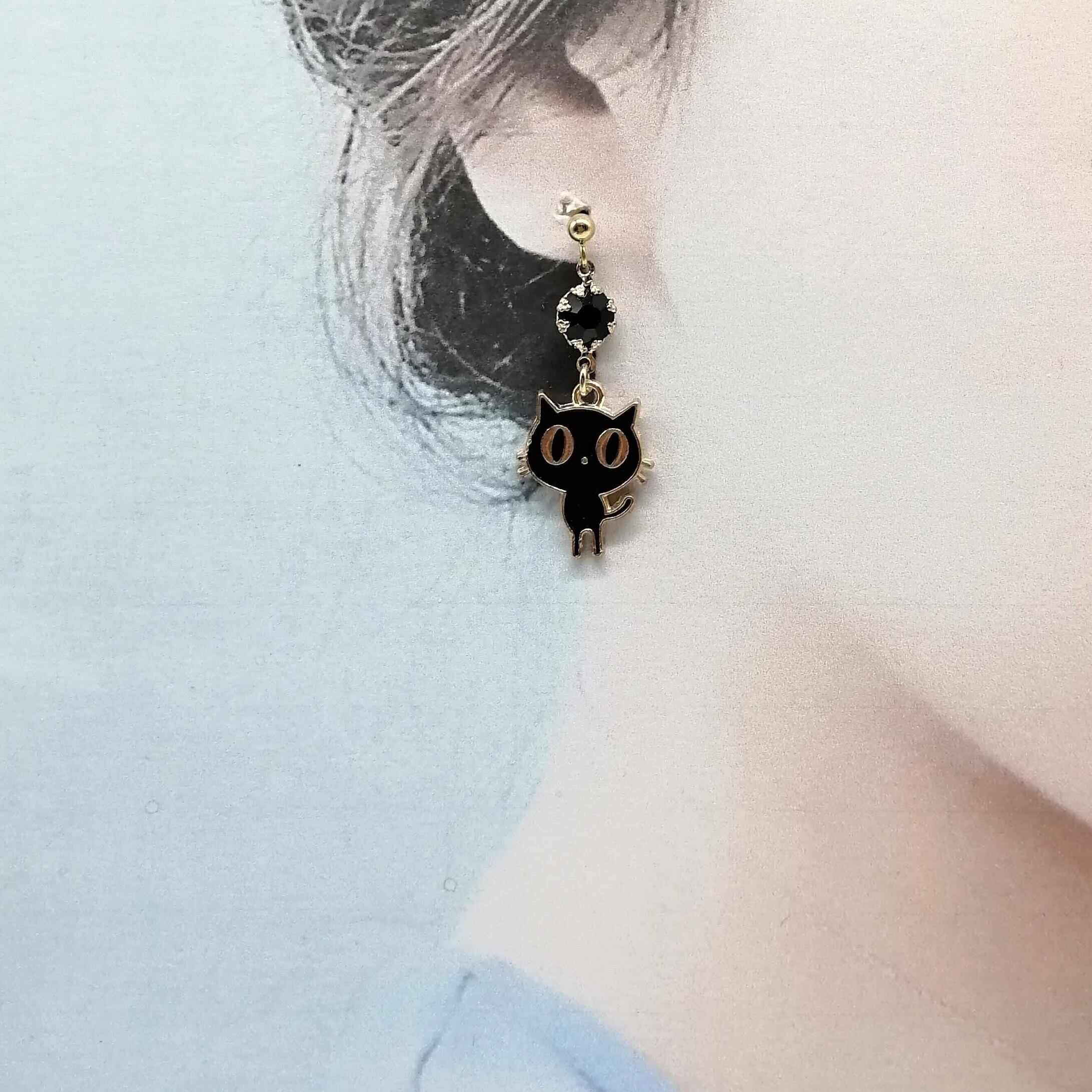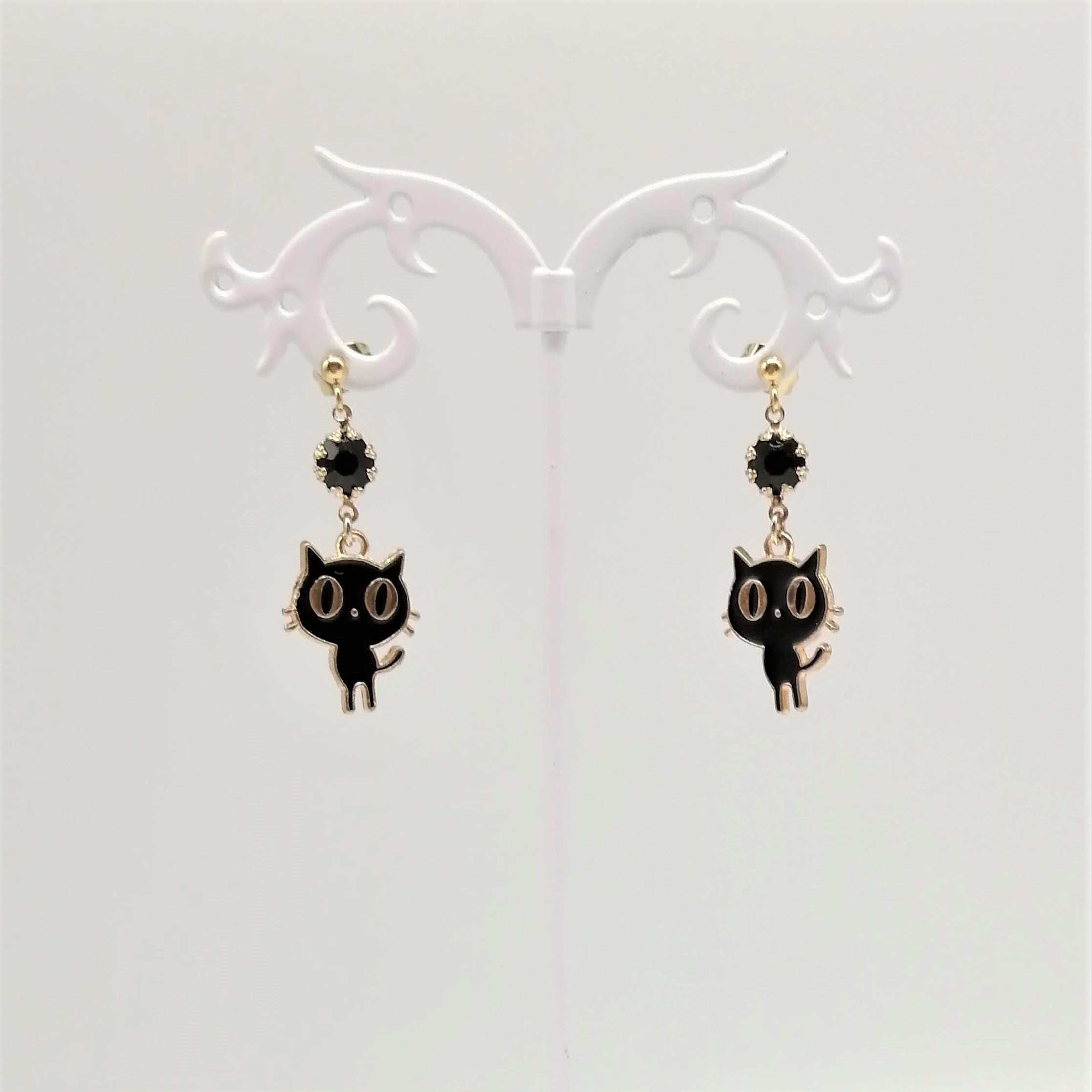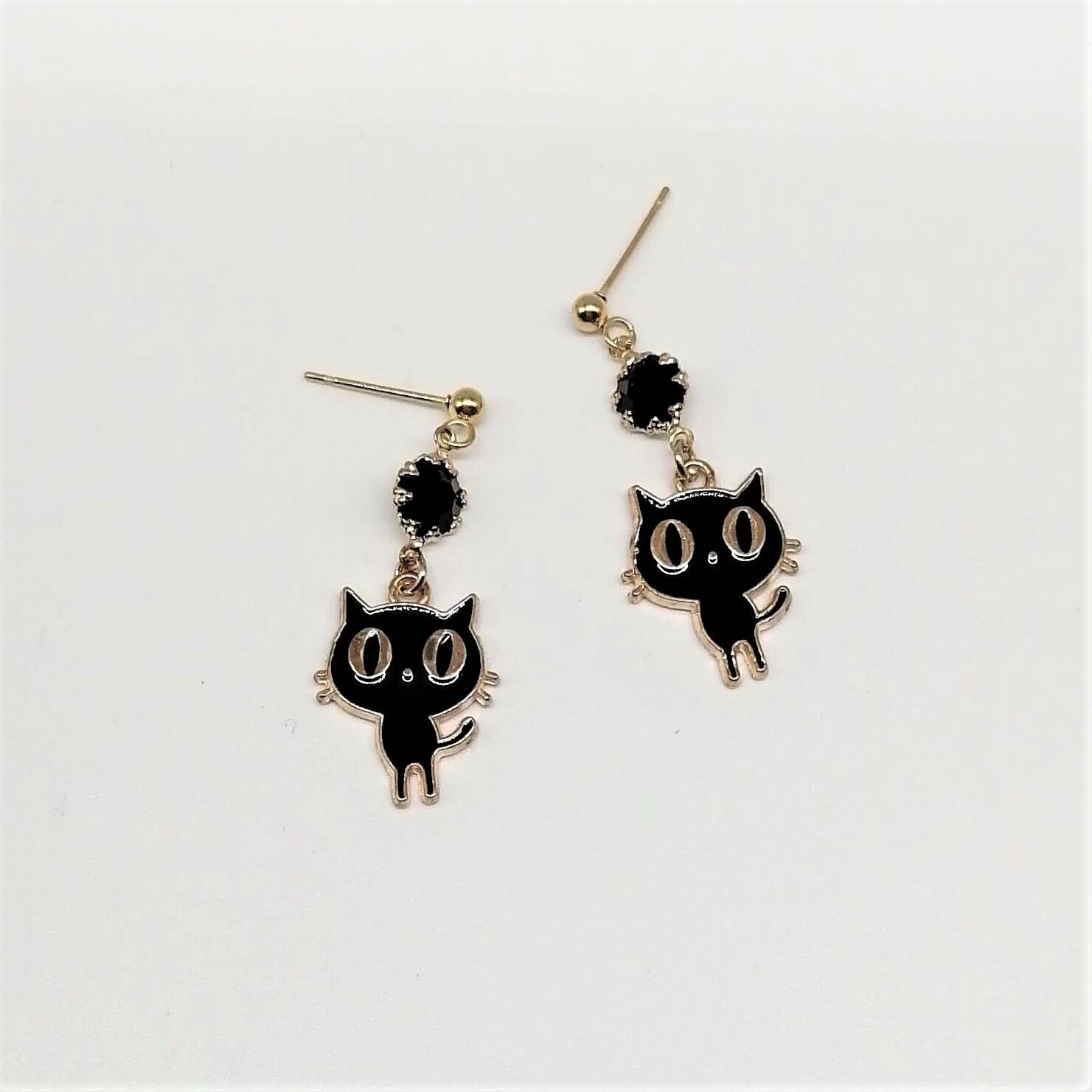 【サージカルステンレス ピアス】黒猫 ブラック ネコ カット面ガラス イヤリング