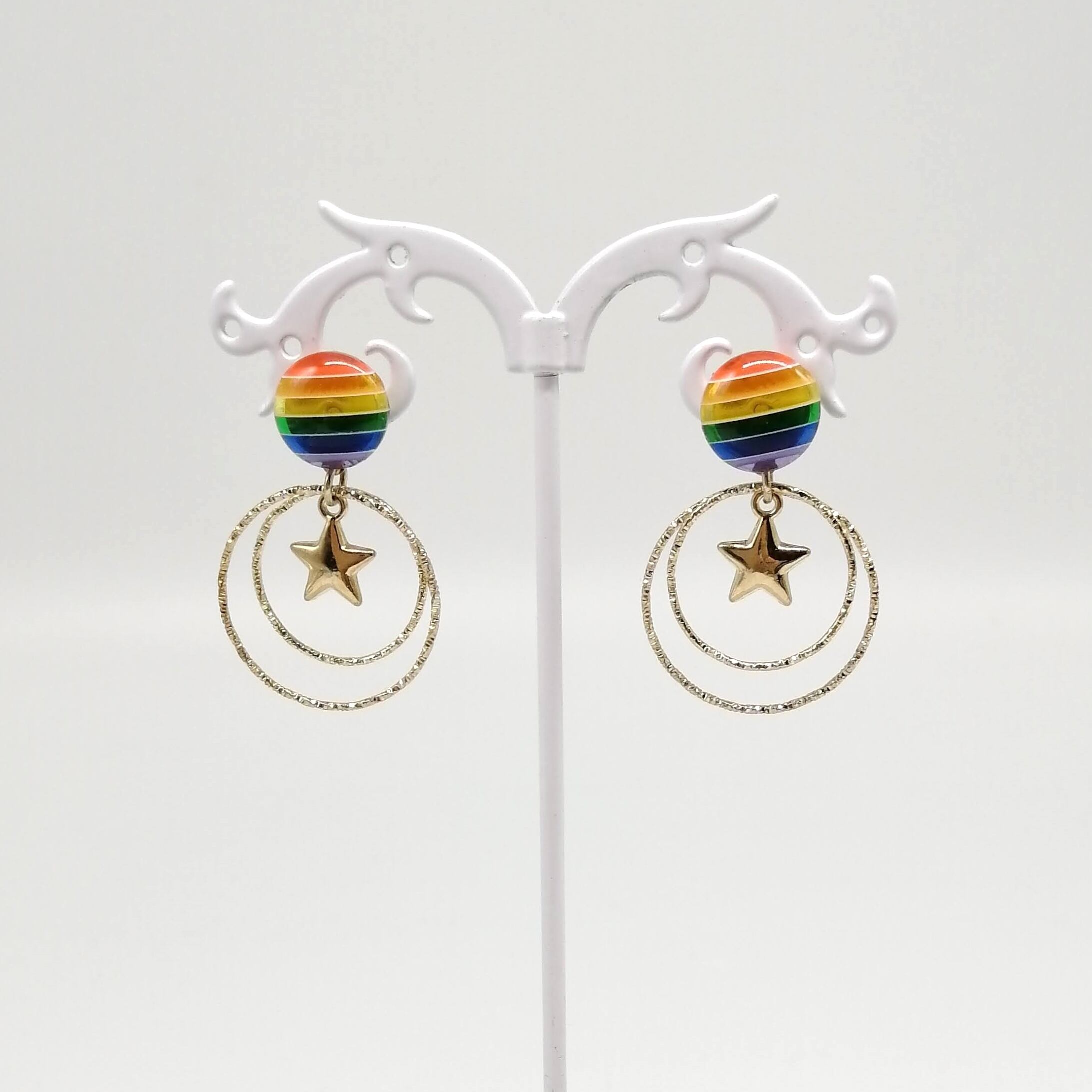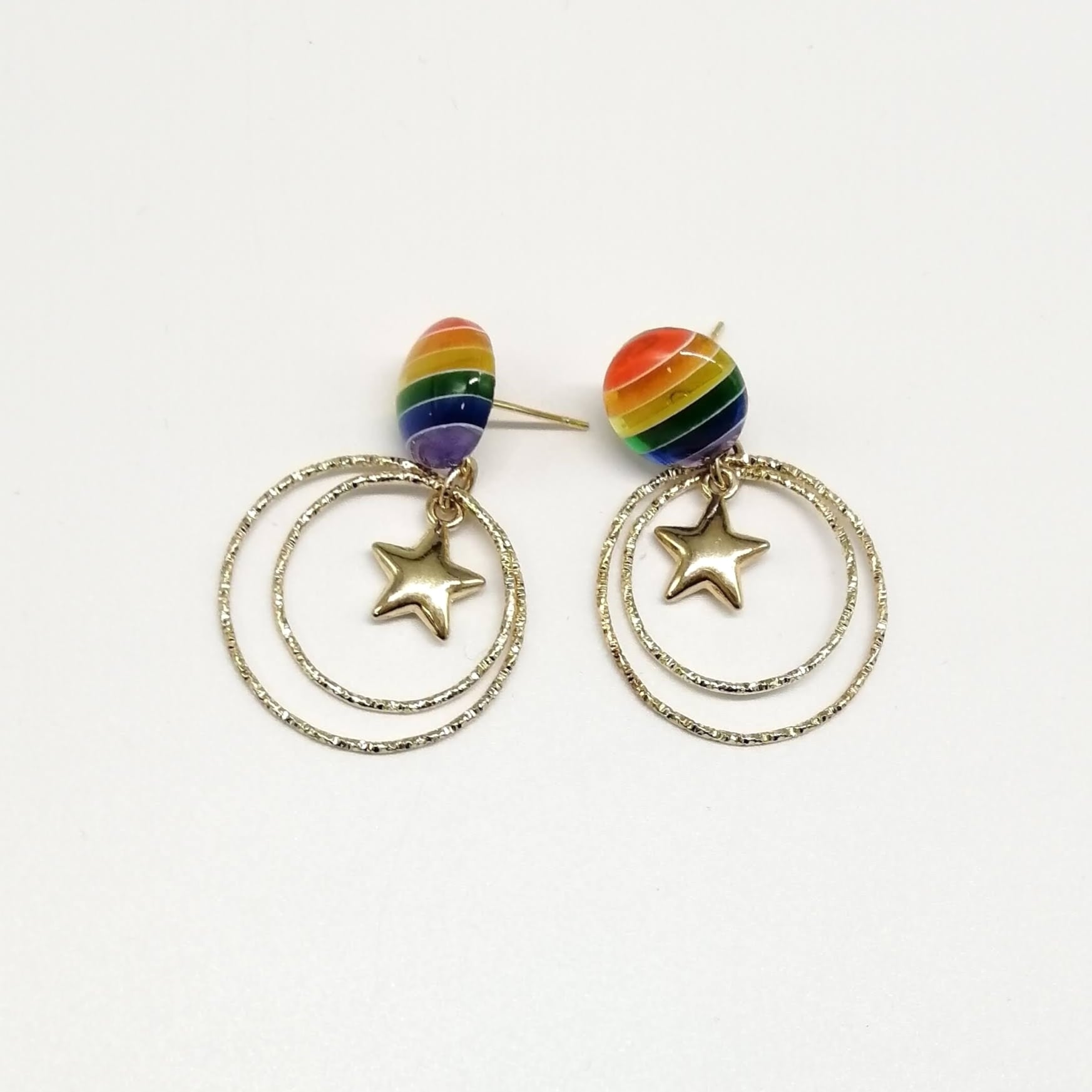 虹色のストライプ×星×ツイストラウンドの組み合わせのピアスです。