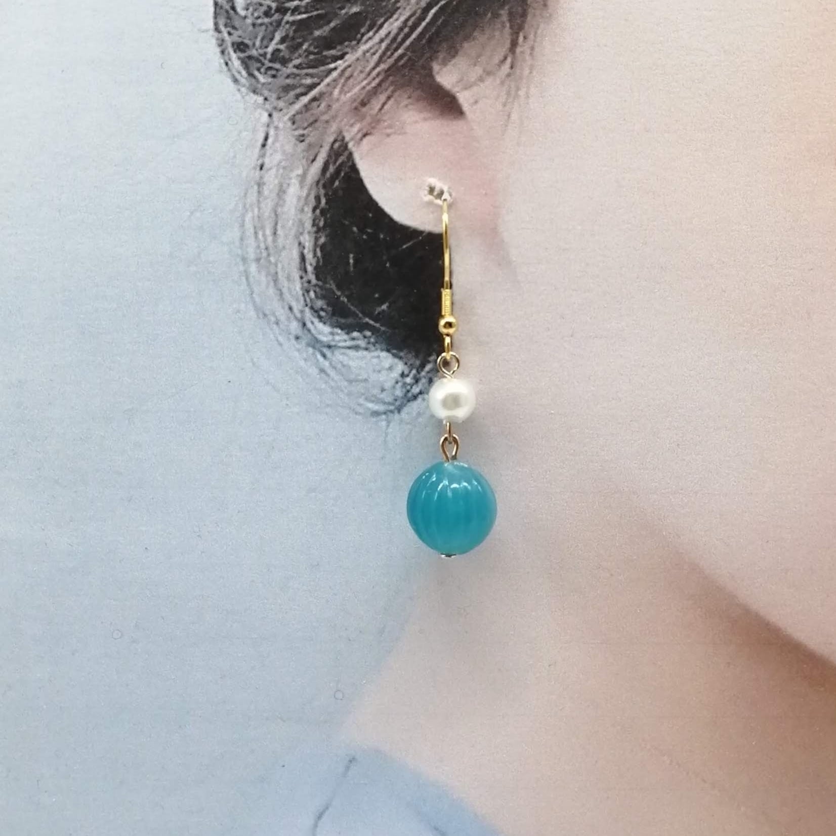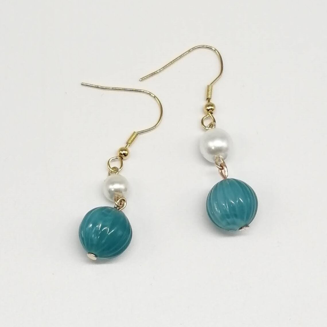 ホワイトのパール×ブルー色のメロンビーズを合わせたピアスです。